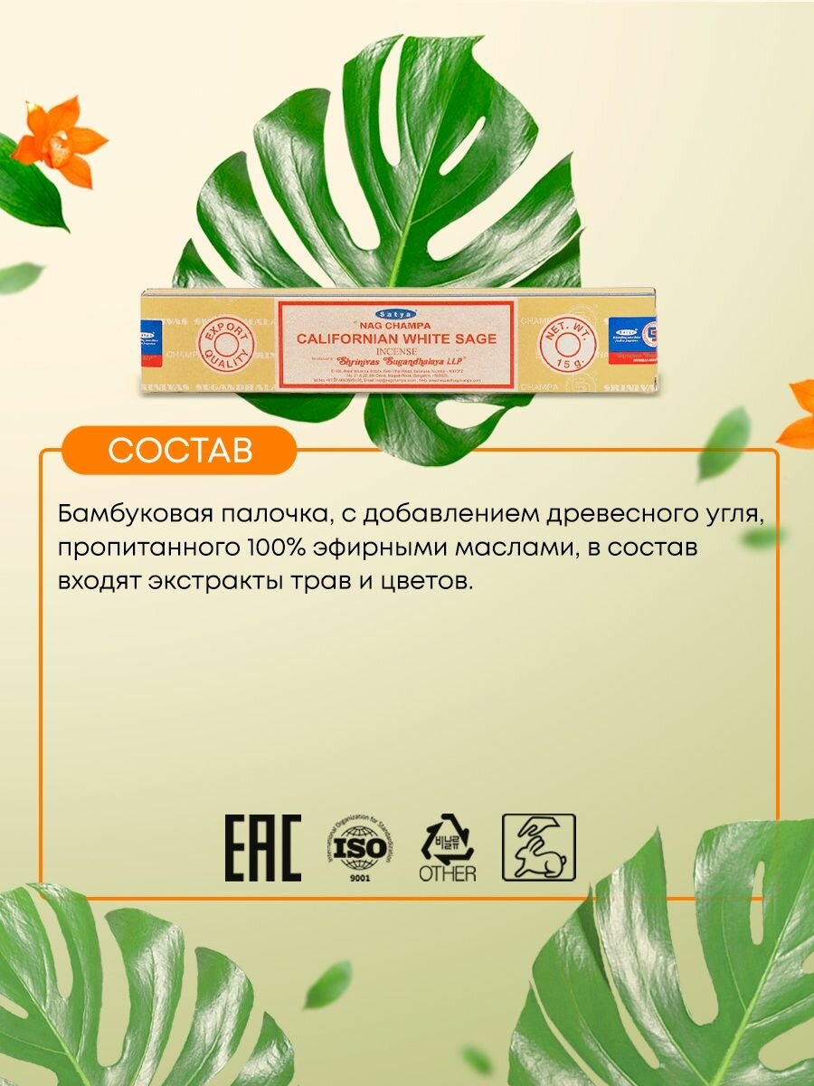 Ароматические палочки / Благовония "Сатья Калифорнийский белый шалфей / Satya Californian White Sage"