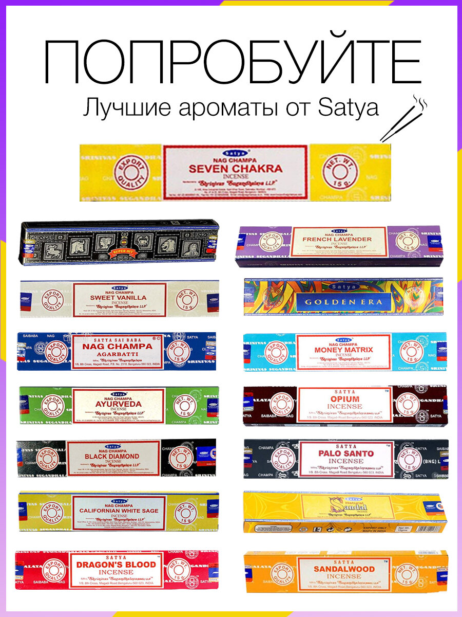 | Дополнительная информация | Высококачественные индийские благовония Satya приготовлены вручную по традиционным рецептам. |