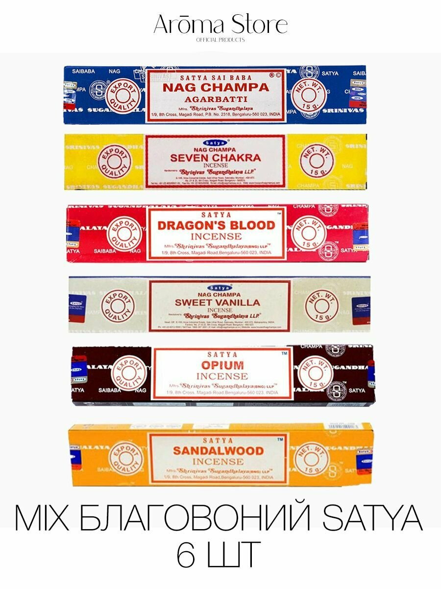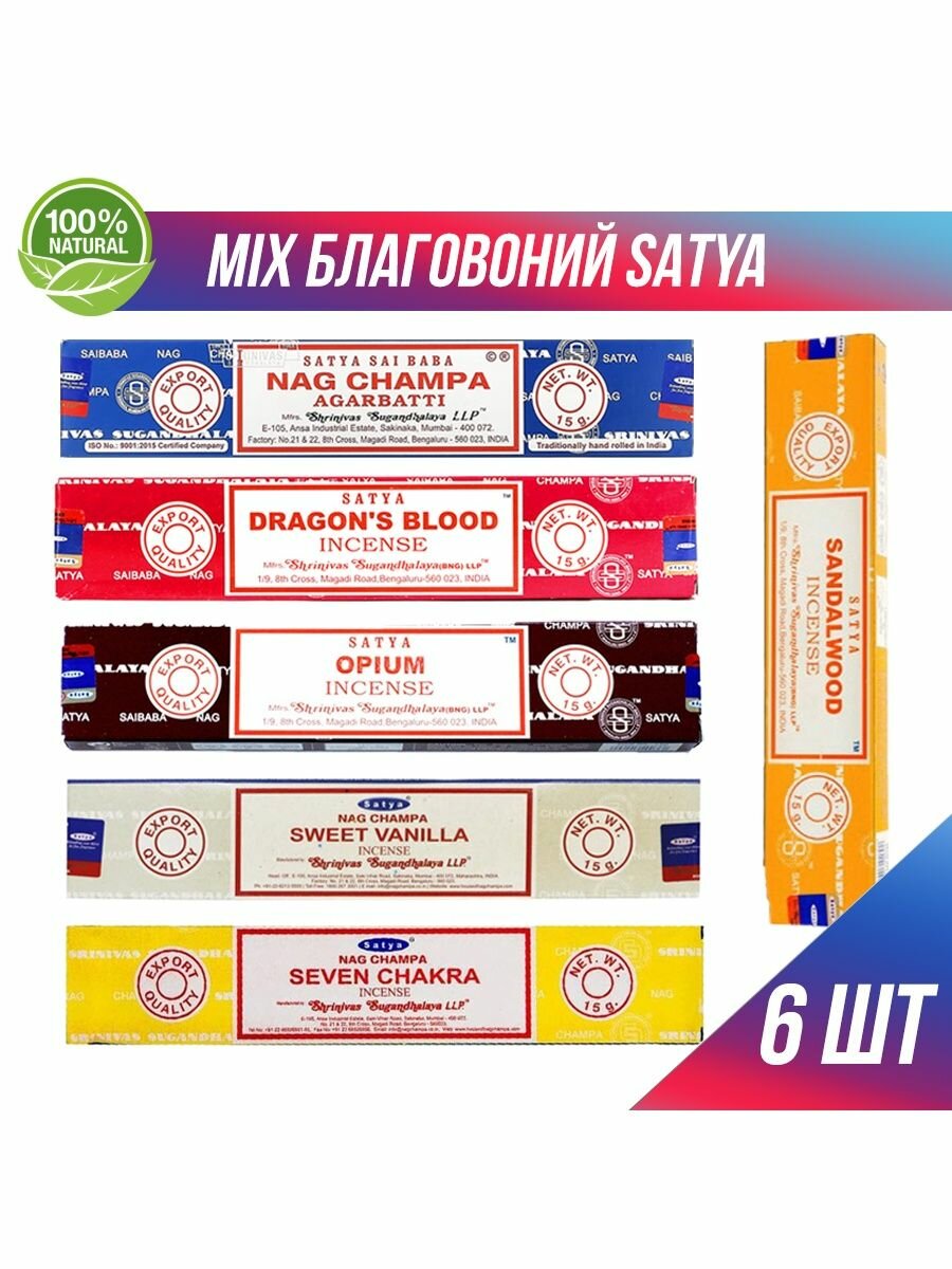 Купить Благовония палочки Satya набор из разных ароматов, 6 упаковок