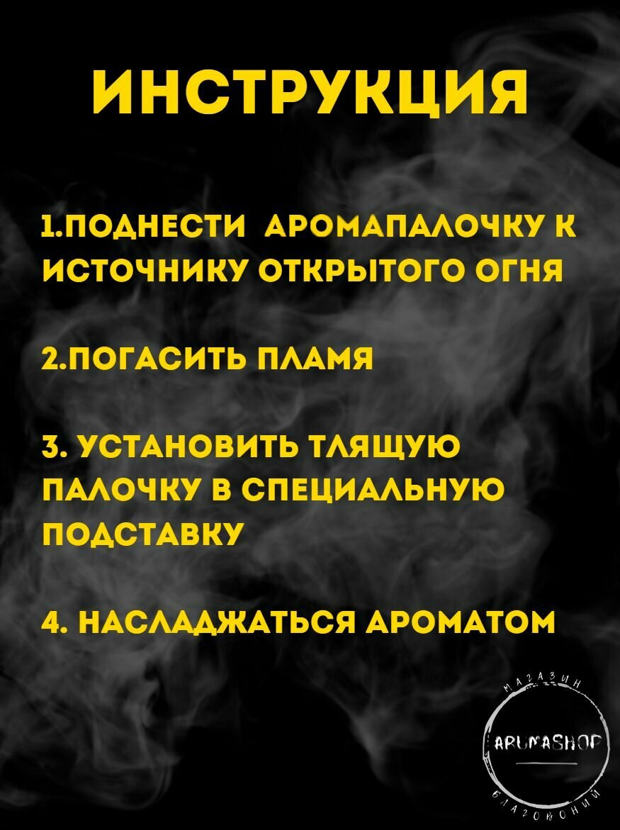 | Дополнительная информация | Воскуривание благовоний – настоящее искусство. Соблюдение всех нюансов позволит не только насладиться приятным ароматом, но и извлечь из этого пользу: - установите ароматическую палочку на специальную подставку (это аксессуар, защищающий мебель от пепла и произвольного возгорания, благодаря чему вы сможете спокойно насладиться сеансом ароматерапии); - зажгите изделие (убедитесь, что появилось небольшое пламя); - затем, после 5-10 секунд потушите его и оставьте тлеть (кончик благовония должен быть красного цвета); - чтобы полностью погасить ароматическую палочку, нужно тлеющим концом воткнуть ее в песок или землю в цветочном горшке. |