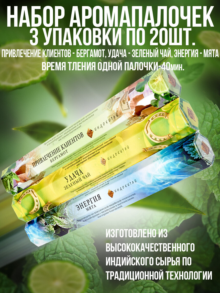 Благовония, Ароматические палочки, Набор аромапалочек"Индокитай" 3упак по 20шт: Мята, Бергамот, Зеленый чай