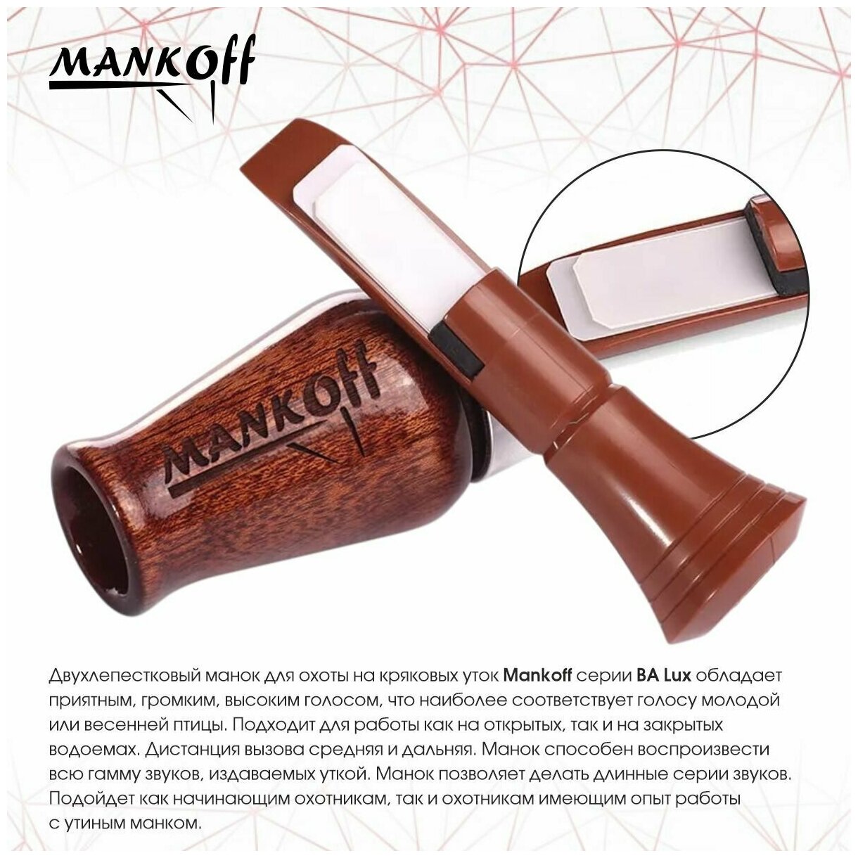 Манок Mankoff на кряковую утку серии BA Lux 2-х язычковый, поликарбонат/дерево (сапеле) интересное: