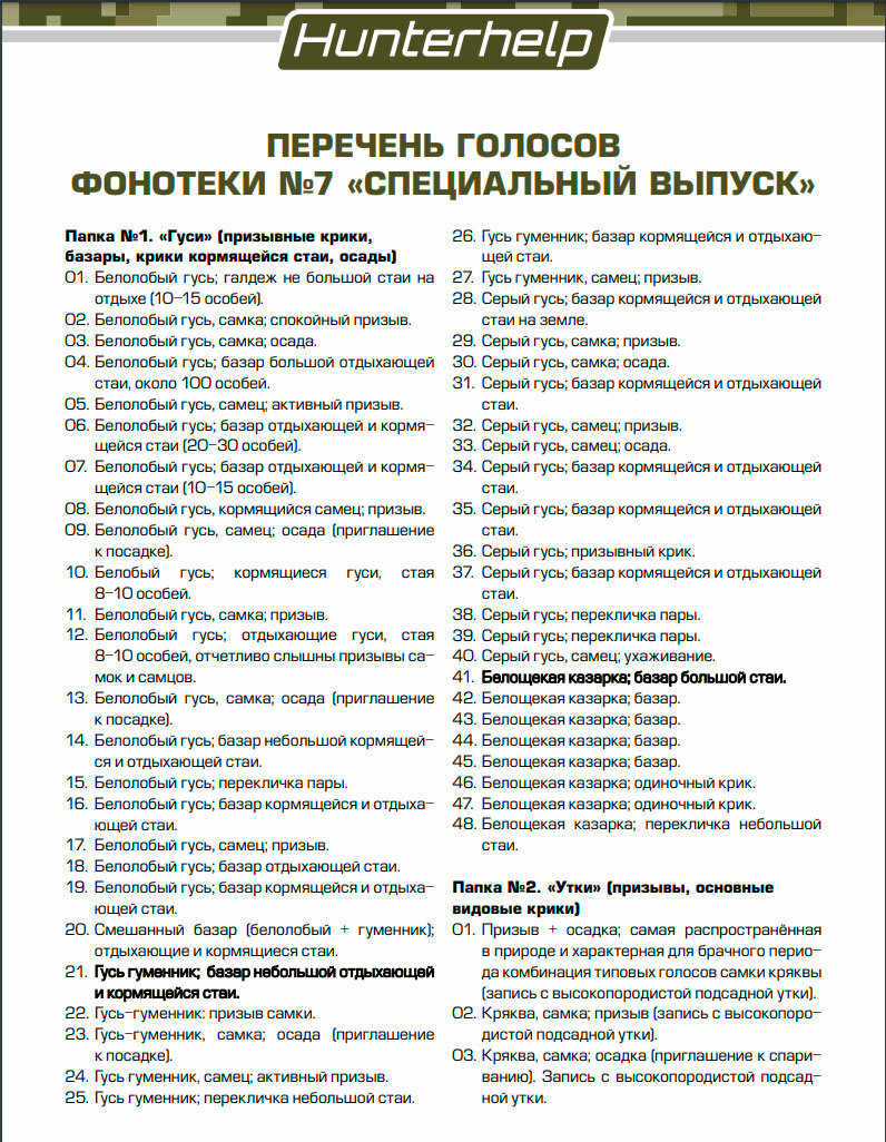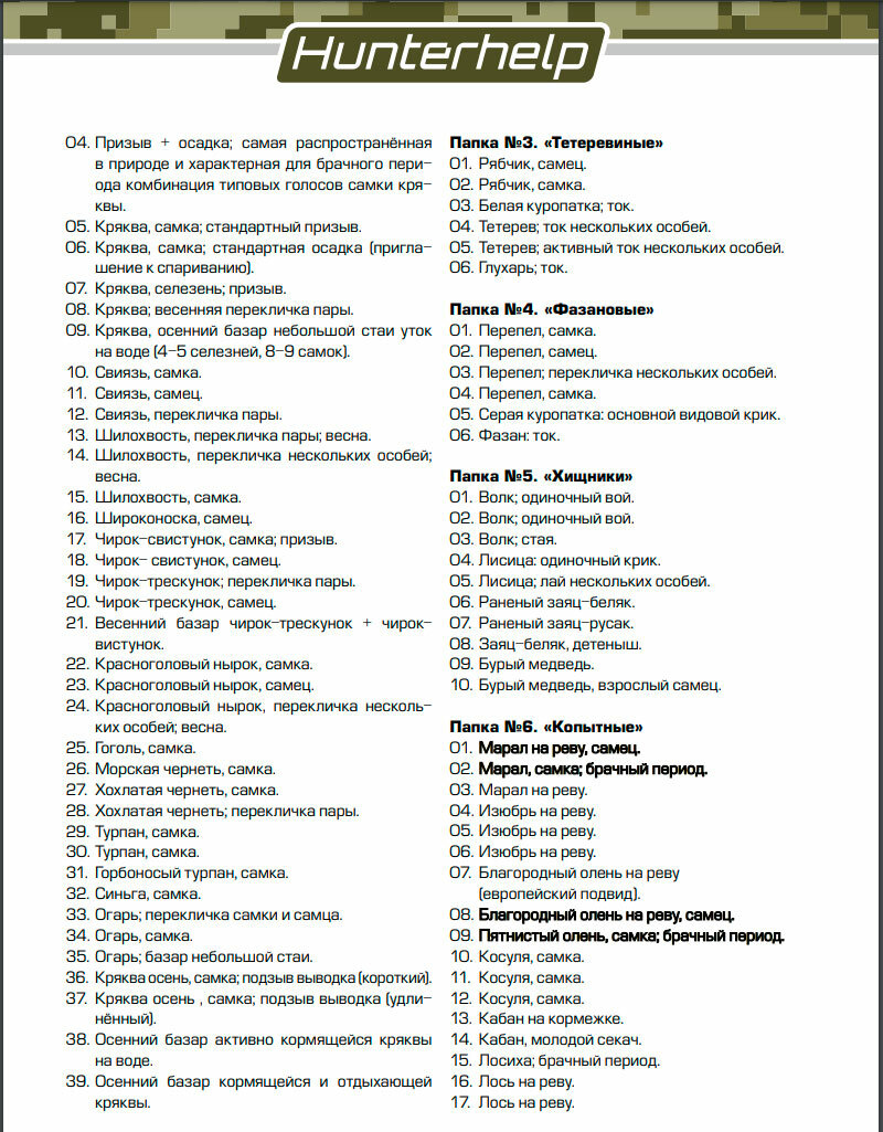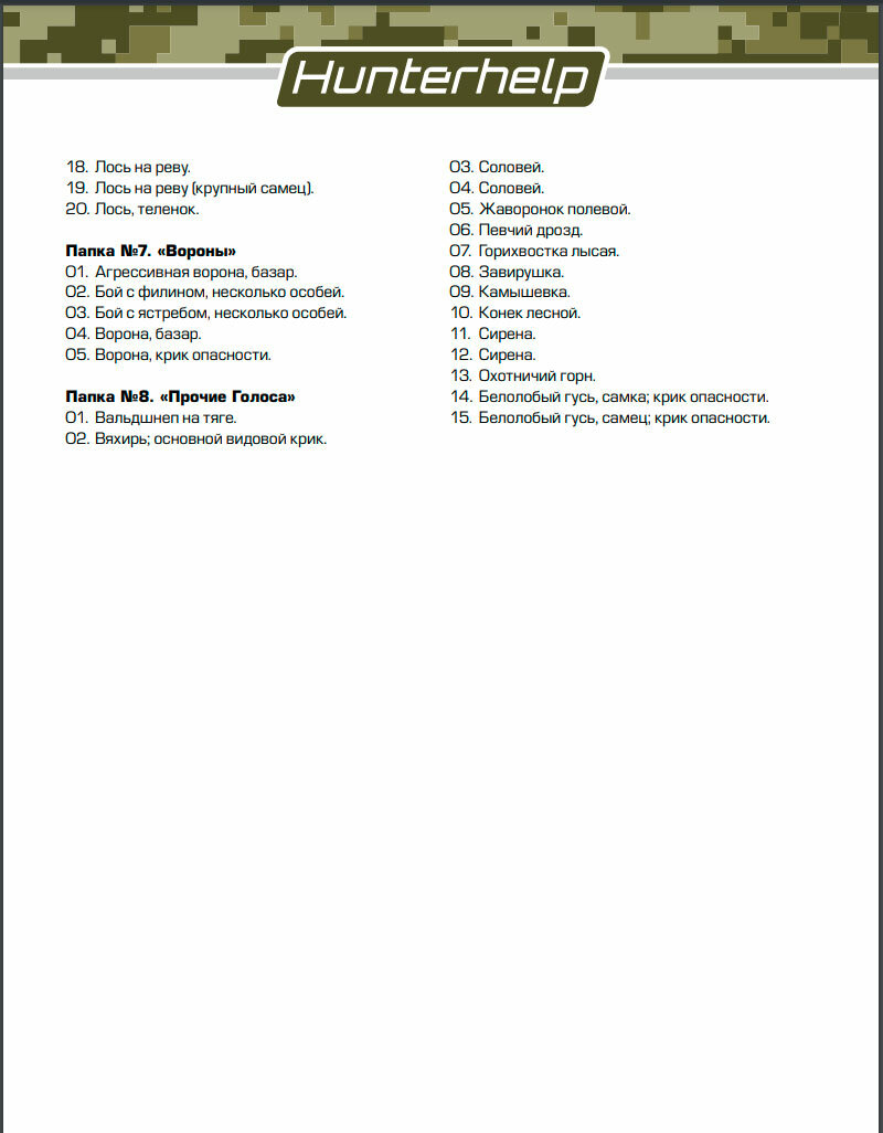 | Имитация звука | волк / ворона / глухарь / гусь / рябчик / утка |