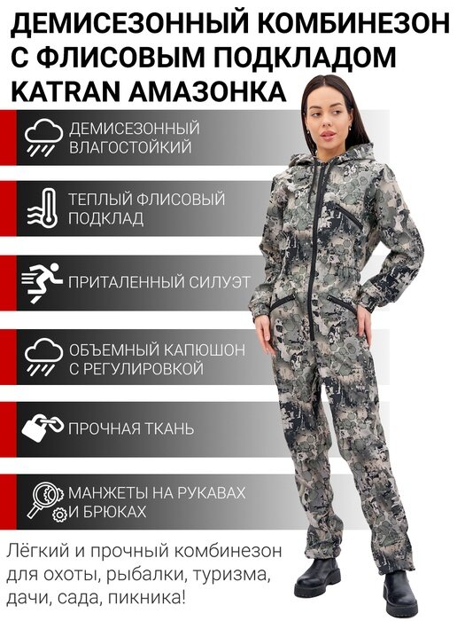 Комбинезон женский костюм на флисе осенний для охоты и рыбалки KATRAN амазонка полофлисовый (цвет серый КМФ), Размер: 48-50