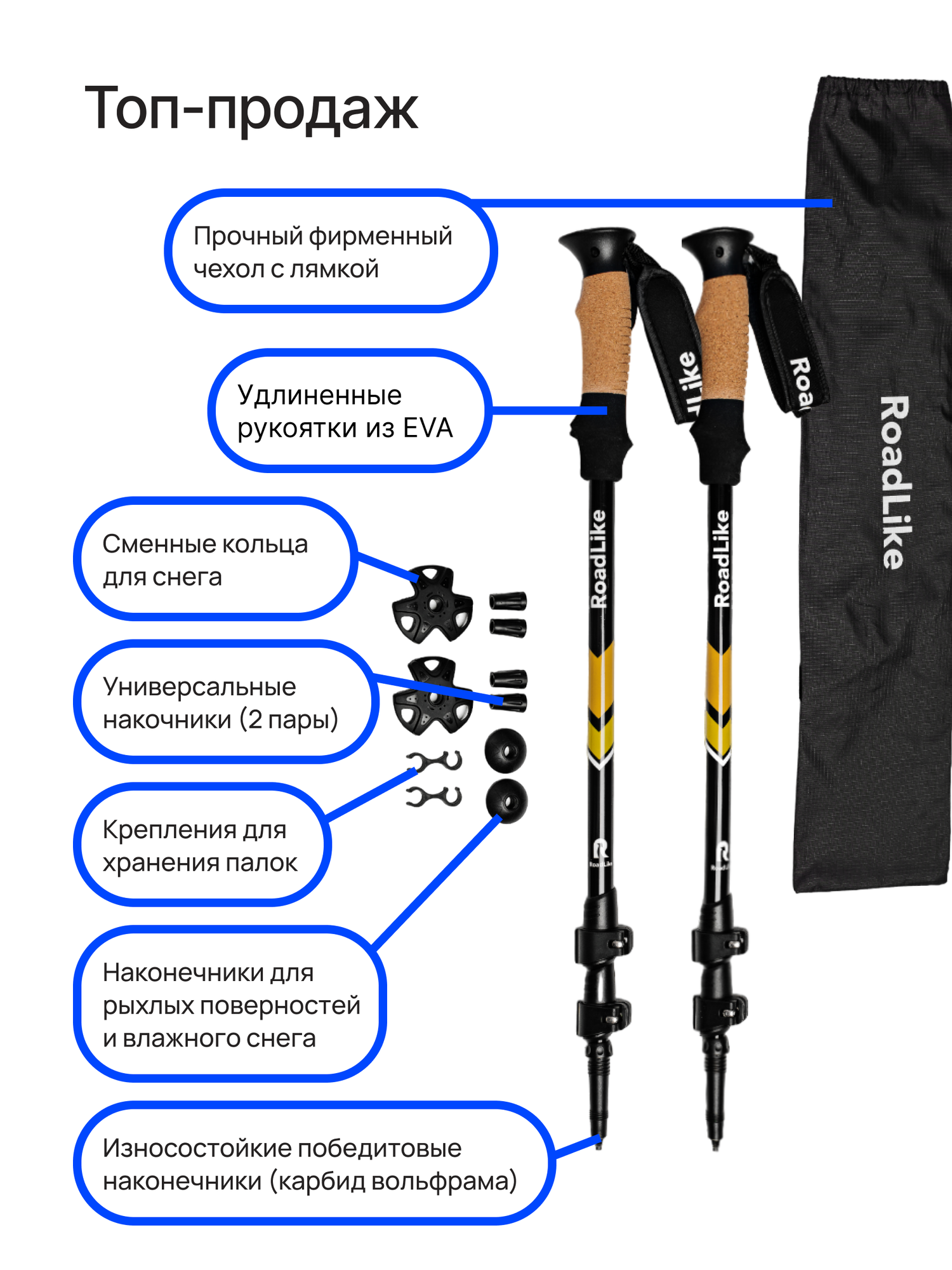 | Особенности | регулировка угла наклона рукоятки, регулируемый темляк, сменные наконечники, чехол в комплекте |