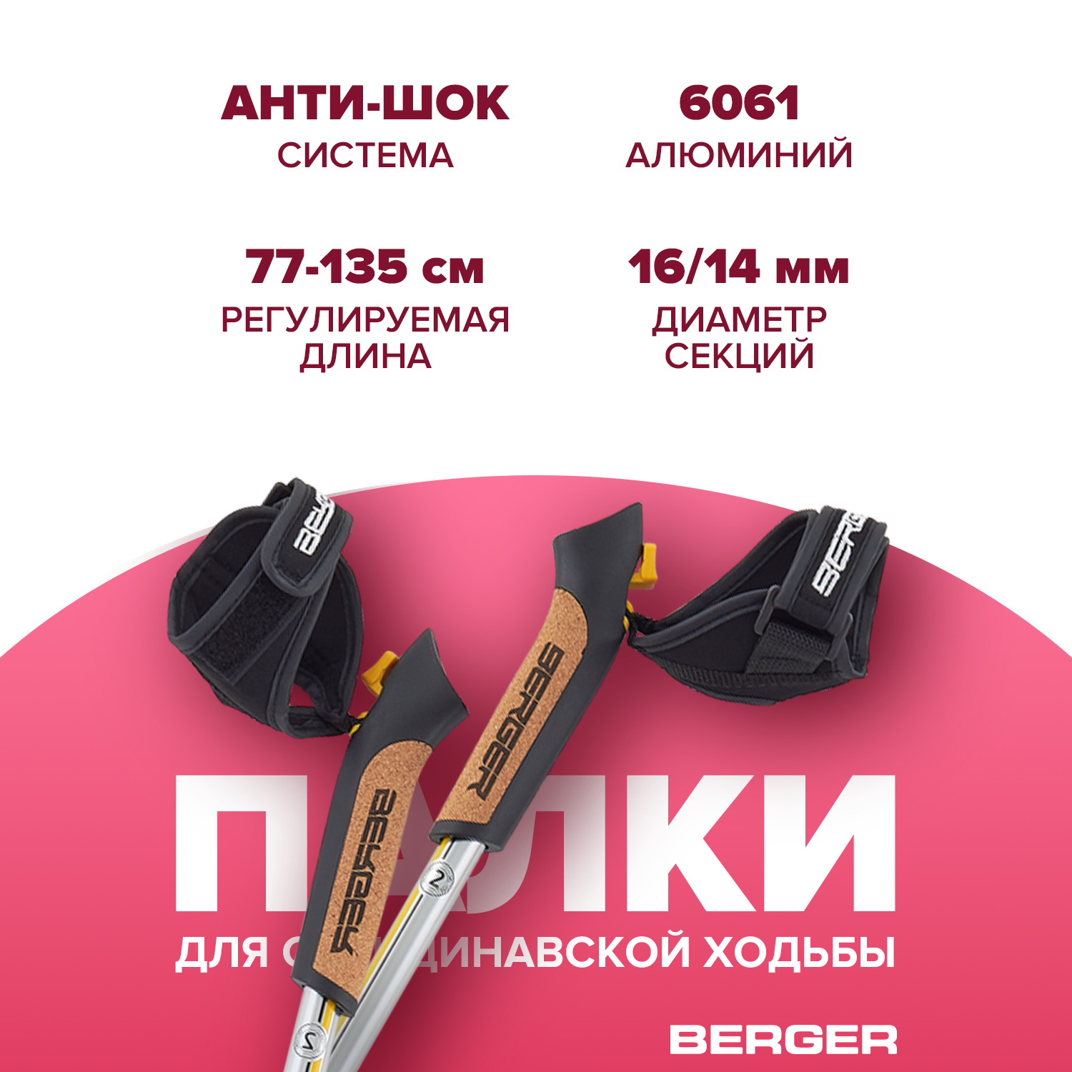 Скандинавские палки Berger Blade, 77-135 см, 2-секционные, серебристый/желтый/черный интересное: