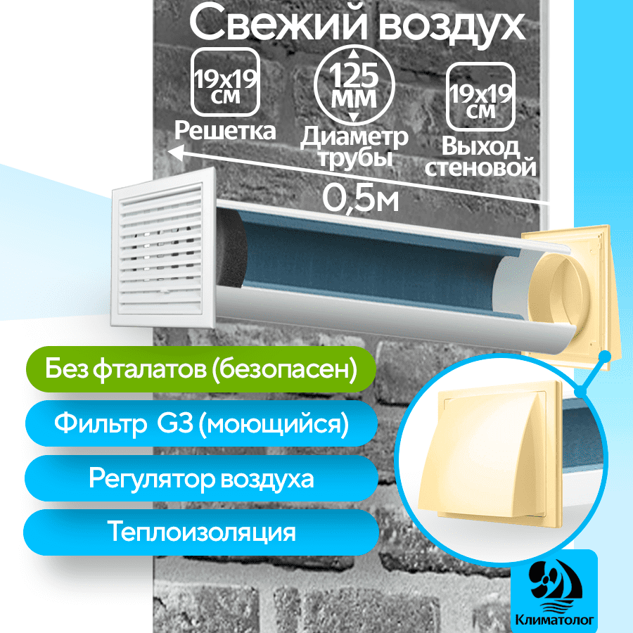 Приточный клапан вентиляционный, КП-2005-04-GW, диаметр 125мм, длина 0,5м