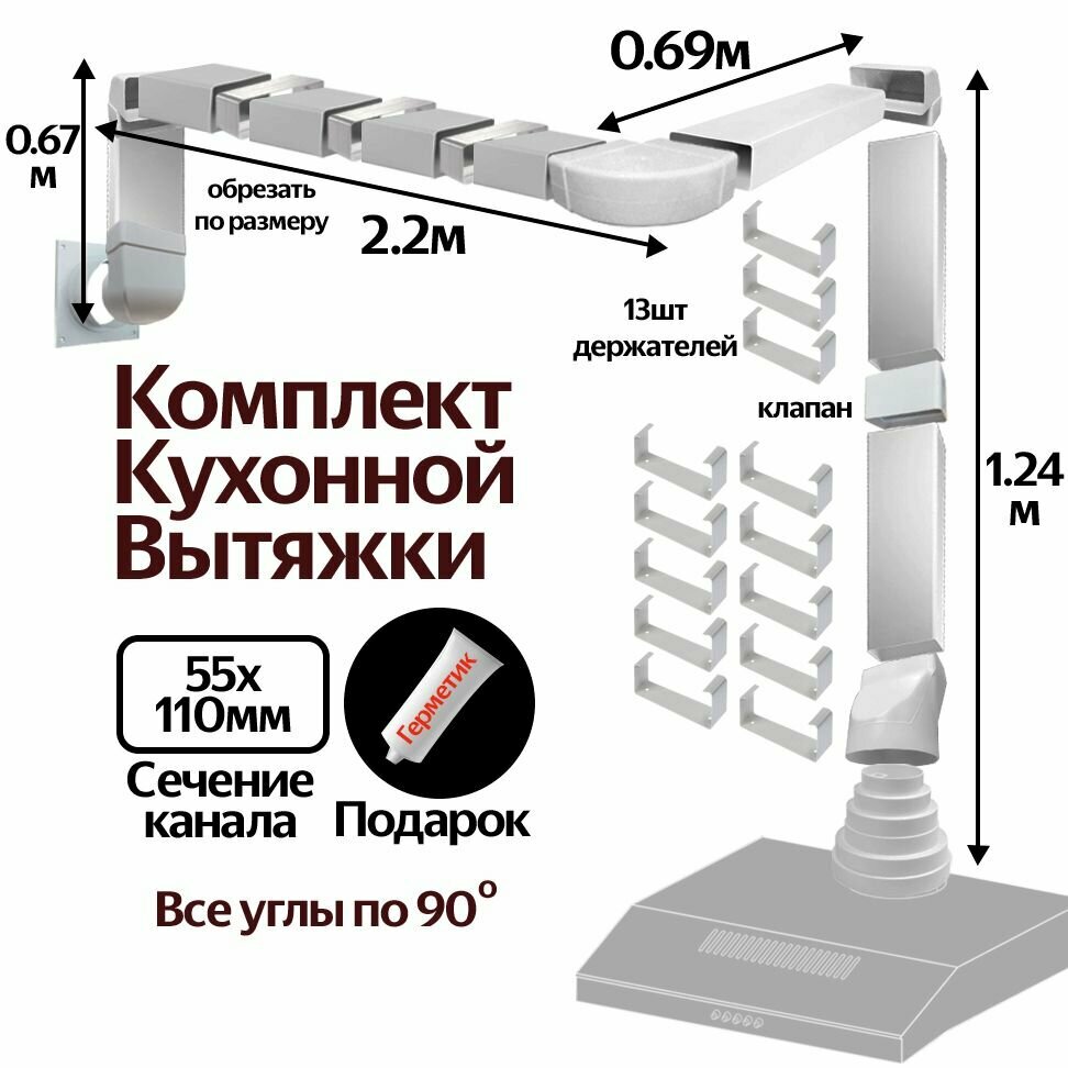 Комплект воздуховодов для кухонной вытяжки из ПВХ 55х110мм, плоские каналы, длинна 2.49м, КЧ5020СС