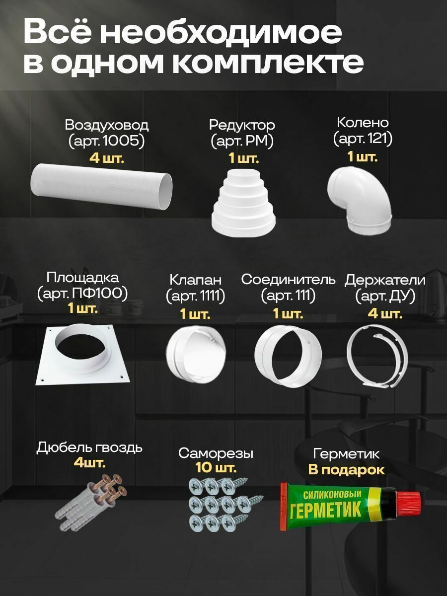Комплект кухонной вытяжки из ПВХ d100мм, длинна 1.74м, КЧ1015