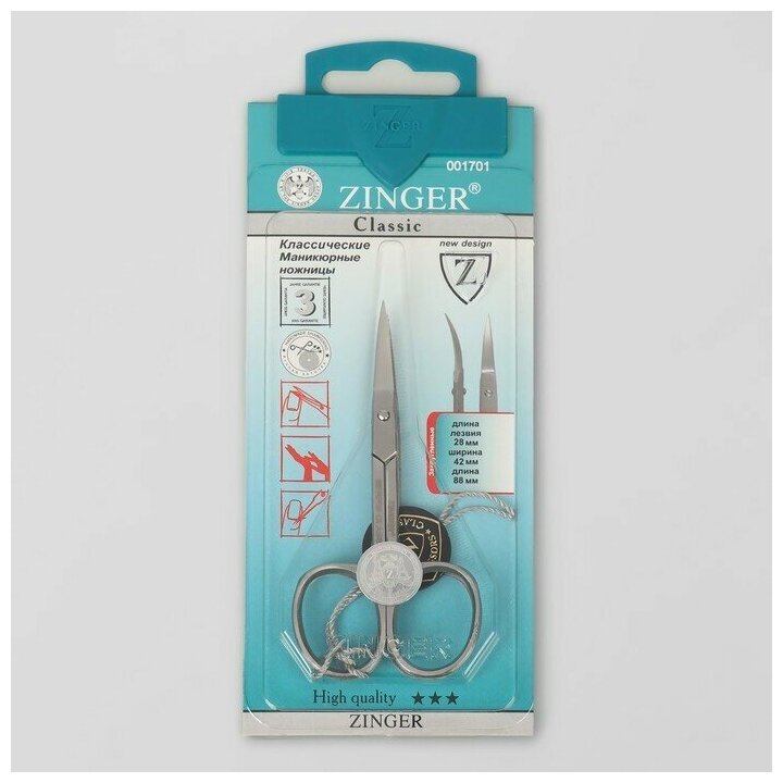 ZINGER Ножницы маникюрные, загнутые, 9 см, на блистере, цвет серебристый, B-113-S-SH