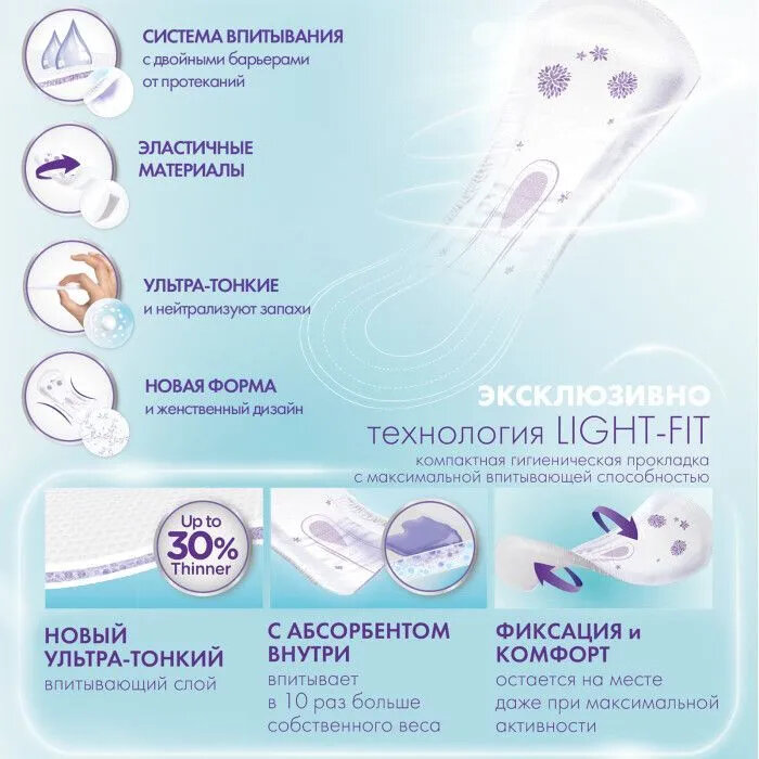 | Особенности | анатомическая форма / ароматизированные / впитывающие / гипоаллергенные / непромокаемые / ночные / с нейтрализатором запаха |