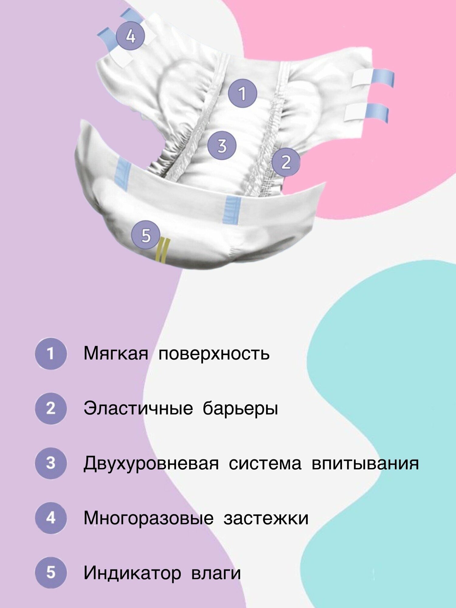 | Особенности | антибактериальные / впитывающие / гипоаллергенные / многоразовые застежки / непромокаемые / ночные / с индикатором наполнения / с нейтрализатором запаха |
