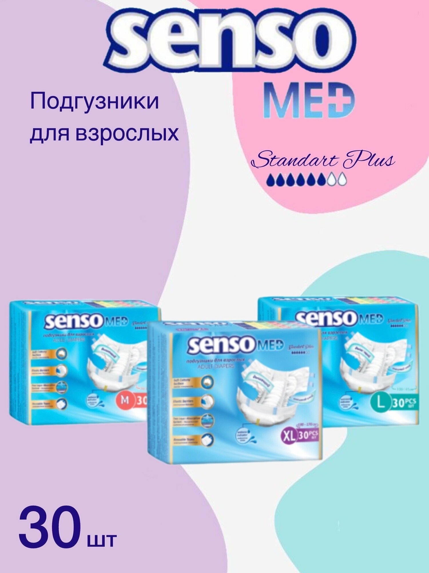 Подгузники для взрослых Senso Med, размер L, 30 штук, 6 капель (100-145 см обхват талии)
