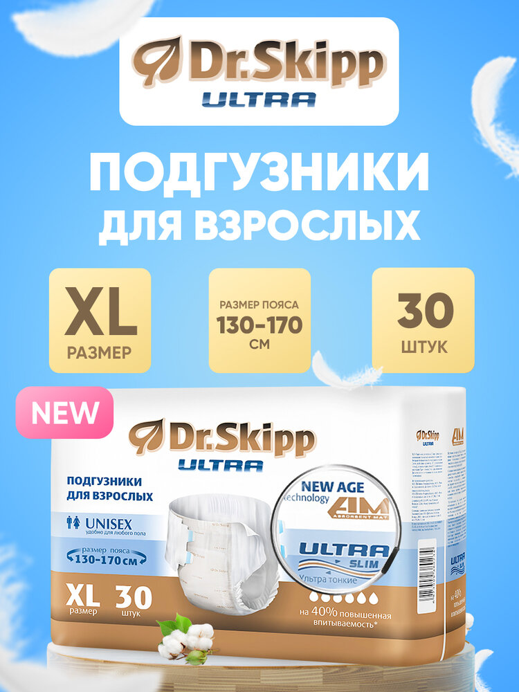 СохранитьПодгузники для взрослых Dr.Skipp Ultra, размер XL (130 - 170 см), 30шт, 8109 интересное: