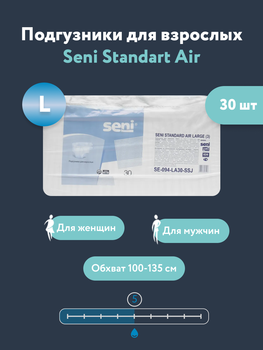 Подгузники для взрослых Seni Standart AIR Размер: L (3) 5 капель 30 шт. интересное: