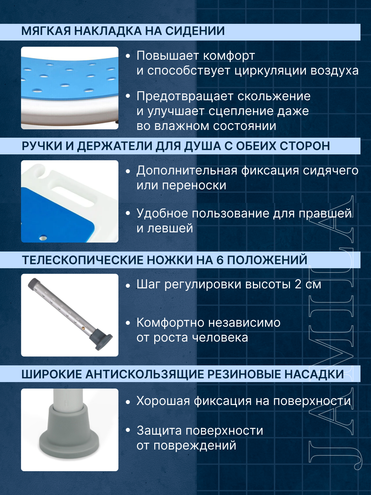 Ниже Вы можете прочитать отзывы на Стул для ванны со спинкой, ознакомится с подробными характеристиками, посмотреть интересные обзоры и фотографии на Стул для ванны со спинкой.