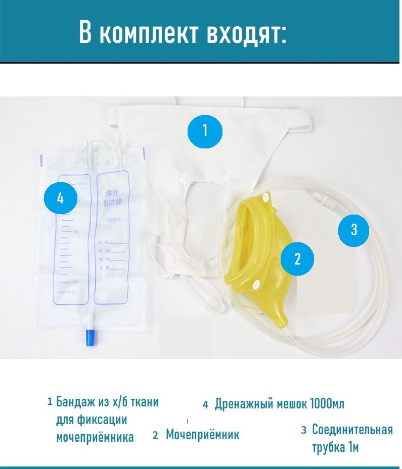 | Комплектация | Силиконовый мочеприёмник-писуар - 1шт. Трусики-бандаж - 1 шт. Мочевыводящая трубка - 1 шт. Дренажный мешок 1000мл - 1шт. |
