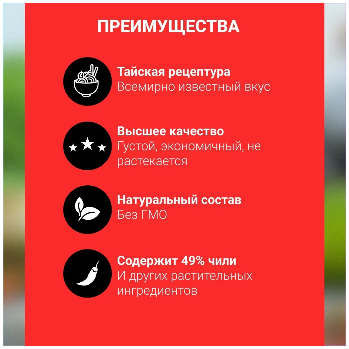 | Состав | вода, сахар, чеснок, уксус спиртовой, соль, перец чили, загустители: Е1422 и ксантановая камедь, усилитель вкуса и аромата Е627, консервант сорбат калия. |