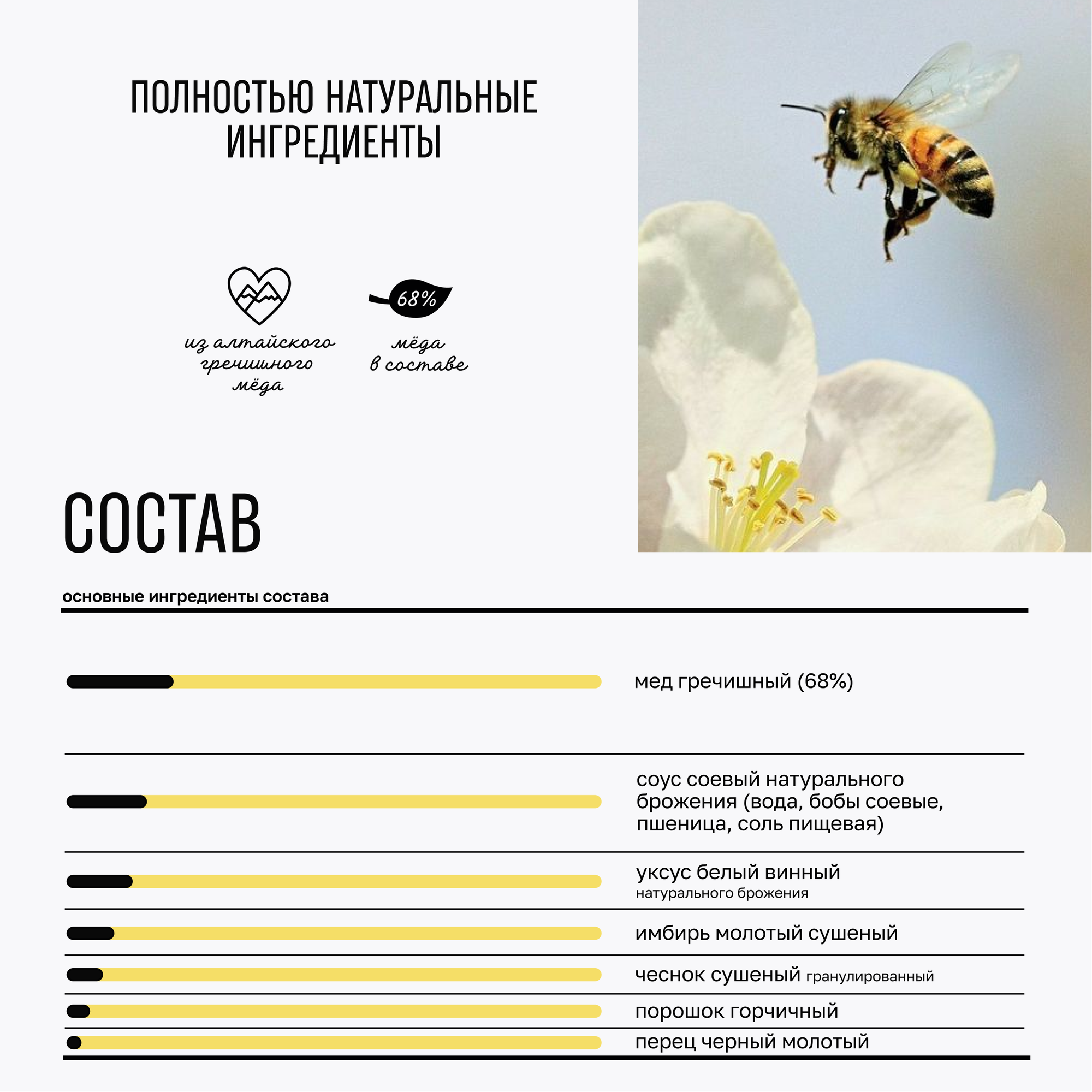 | Состав | мед гречишный (68%), соус соевый натурального брожения (вода, бобы соевые, пшеница, соль пищевая), уксус белый винный натурального брожения, имбирь молотый сушеный, чеснок сушеный гранулированный, порошок горчичный, перец черный молотый |