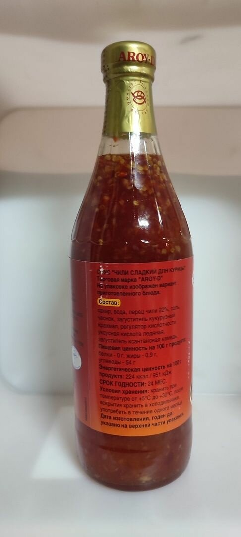 | Состав | сахар, вода, перец чили 22%, соль, чеснок, загуститель дикрахмаладипат ацетилированный, регулятор кислотности уксусная кислота, загуститель ксантановая камедь |