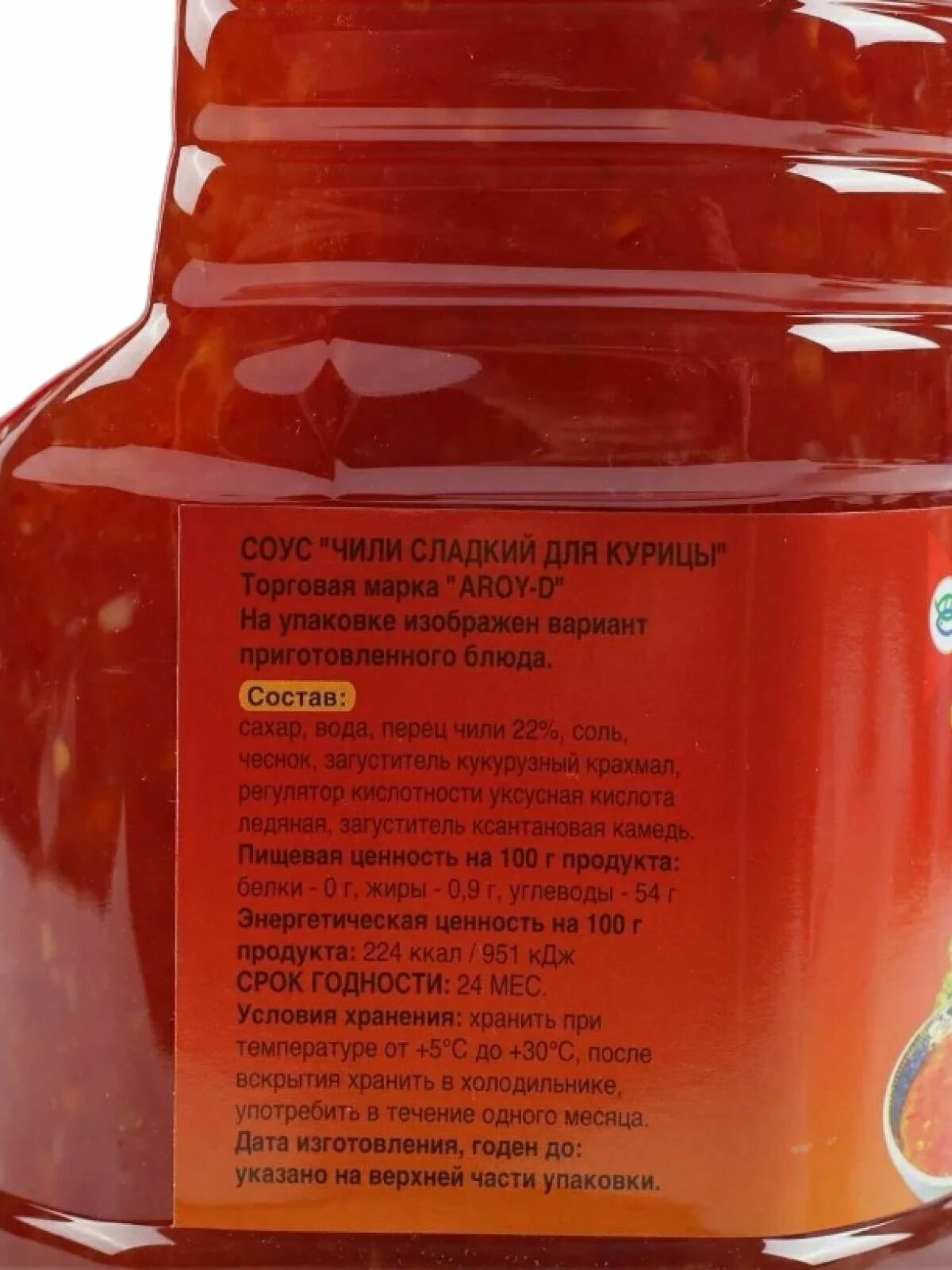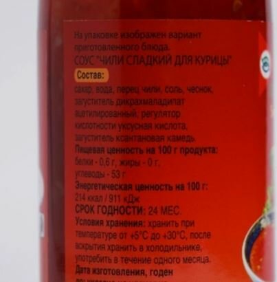 | Состав | сахар, вода, перец чили 22%, соль, чеснок, загуститель дикрахмаладипат ацетилированный, регулятор кислотности уксусная кислота, загуститель ксантановая камедь |