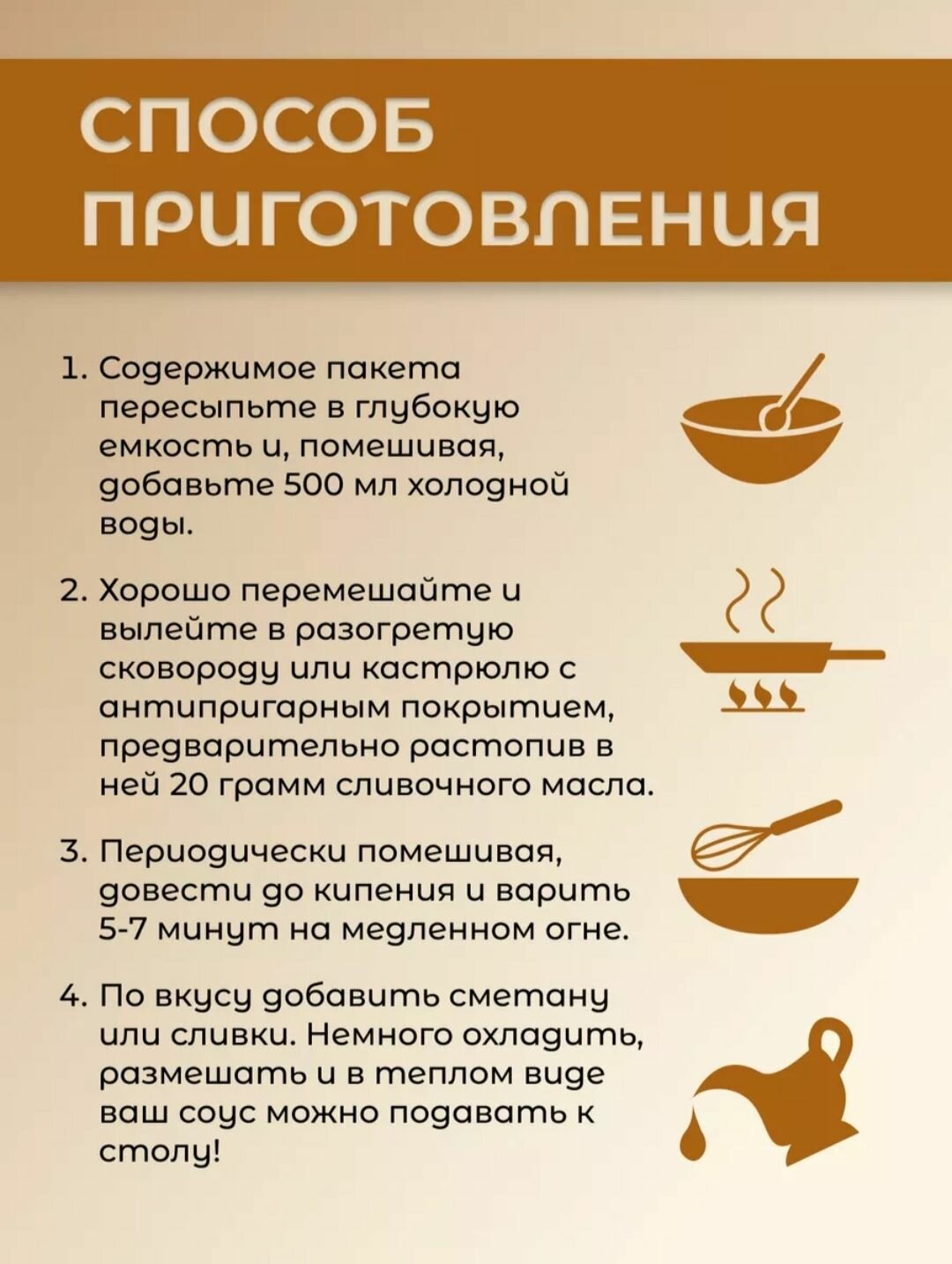 | Дополнительная информация | содержимое пакета пересыпьте в глубокую емкость и, помешивая, добавьте 500 мл холодной воды. Хорошо перемешайте и вылейте в разогретую сковороду или кастрюлю с антипригарным покрытием, предварительно растопив в ней 20 грамм сливочного масла. Периодически помешивая, довести до кипения и варить 5-7 минут на медленном огне. По вкусу добавить сметану или сливки. Немного охладить, размешать и в теплом виде ваш соус можно подавать к столу |