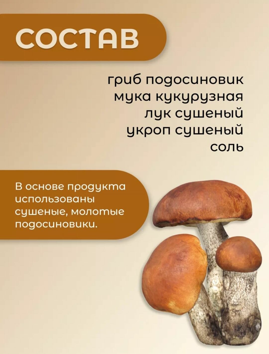 | Состав | подосиновики сушеные молотые, лук сушеный, укроп сушеный, мука кукурузная, соль |