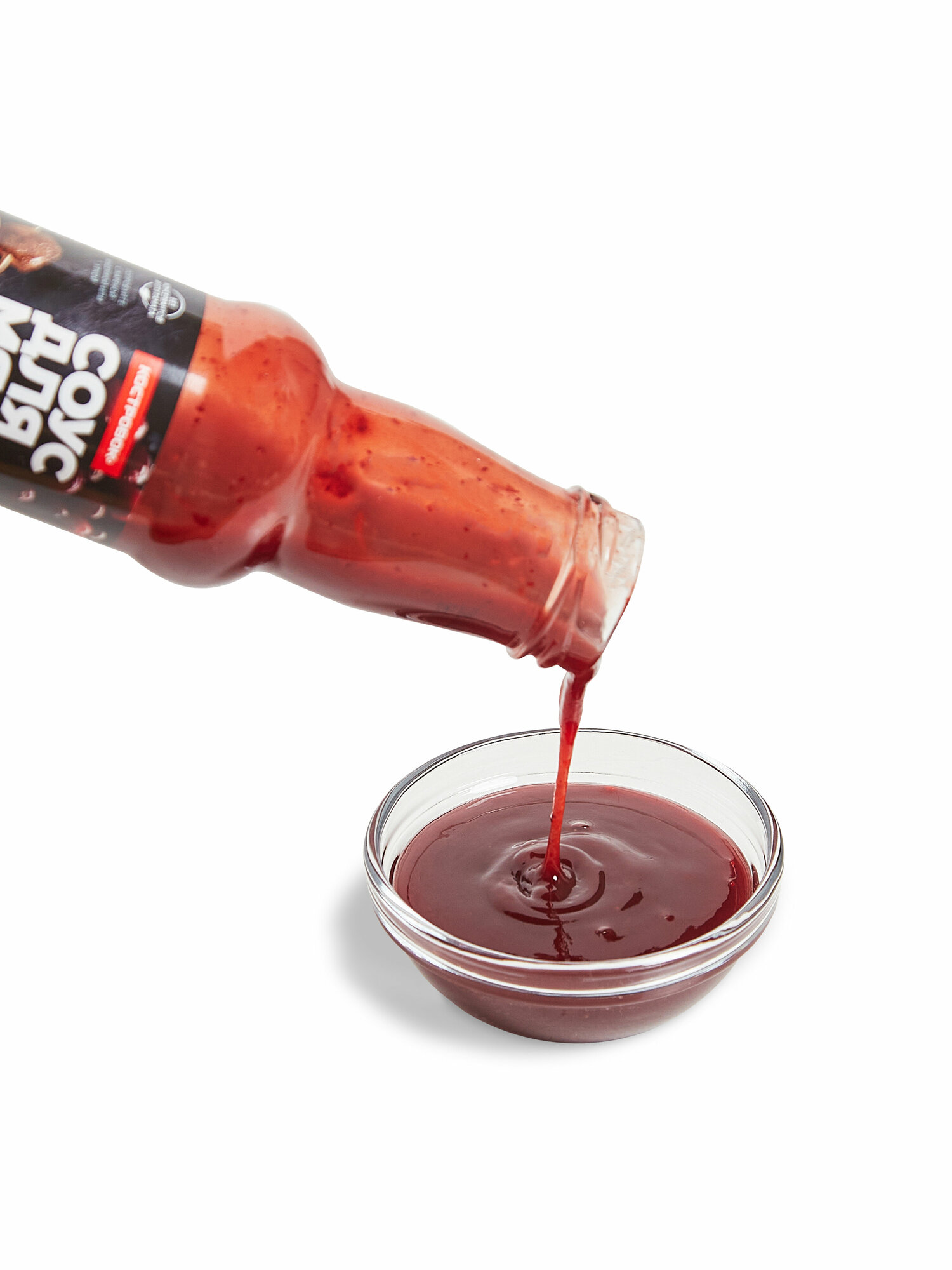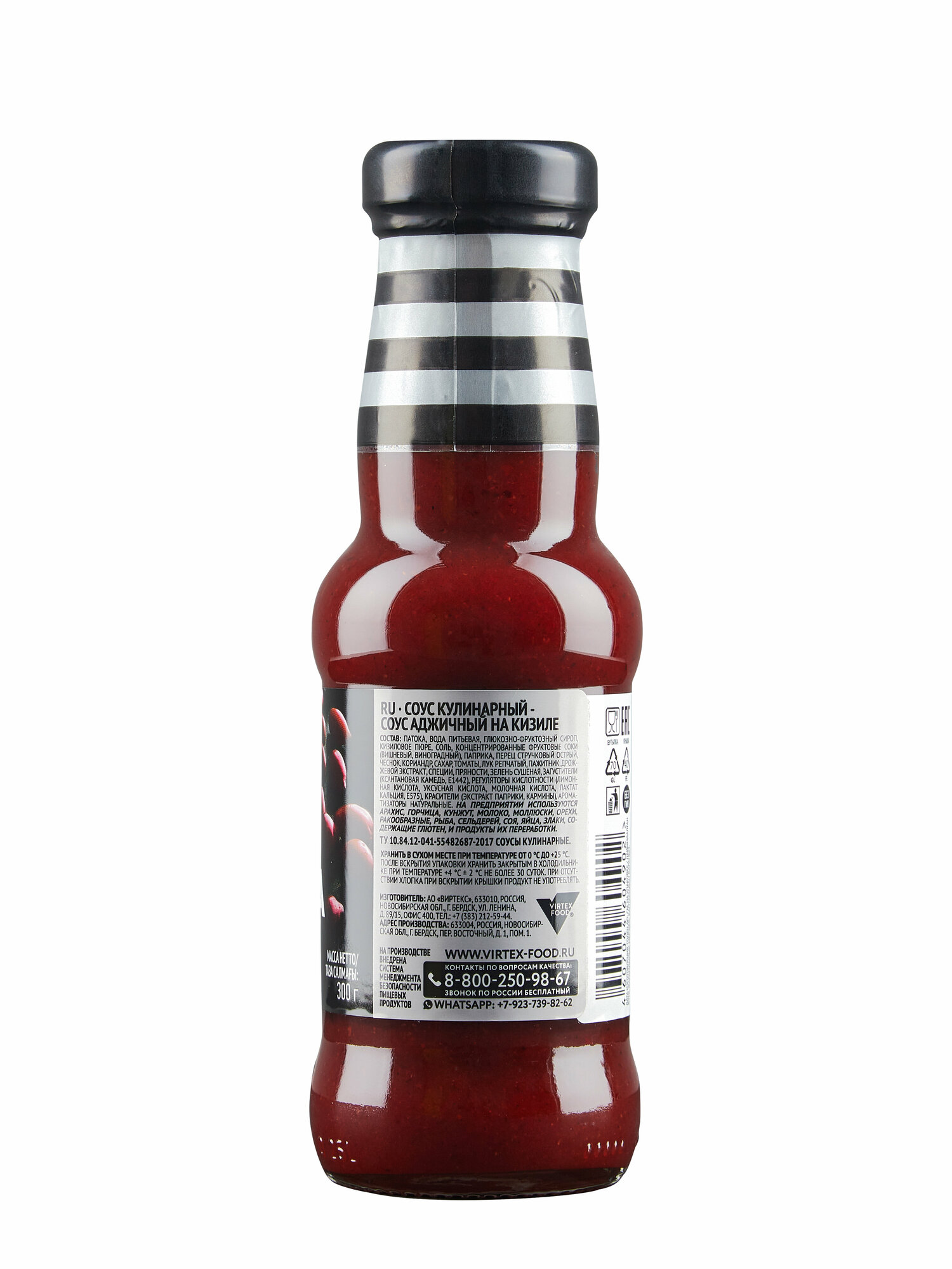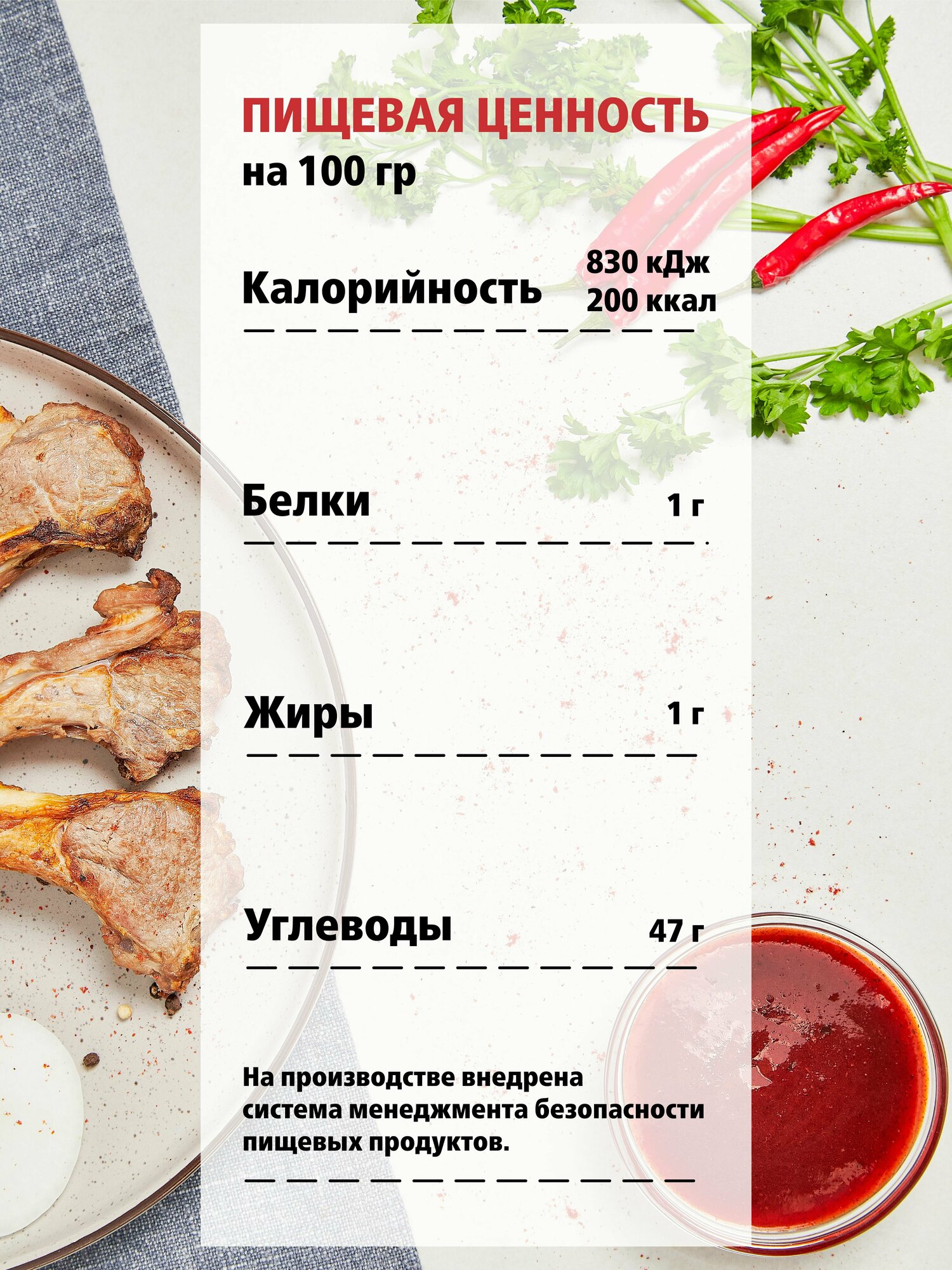 | Состав | вода, брусника, сок вишневый концентрированный, сахар, пюре яблочное, загустители - Е1442, камедь ксантановая, соус аджика, соль, сок апельсиновый концентрированный, сироп глюкозно-фруктозный, стабилизатор Е459, бензоат натрия, сорбат калия |