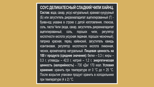 | Состав | вода, сахар, уксус натуральный, глюкоза, загустители (крахмал кукурузный, камедь ксантановая), паста Чили, соль, паприка красная, перец кайенский, регулятор кислотности (кислота лимонная), чеснок, ароматизатор натуральный |