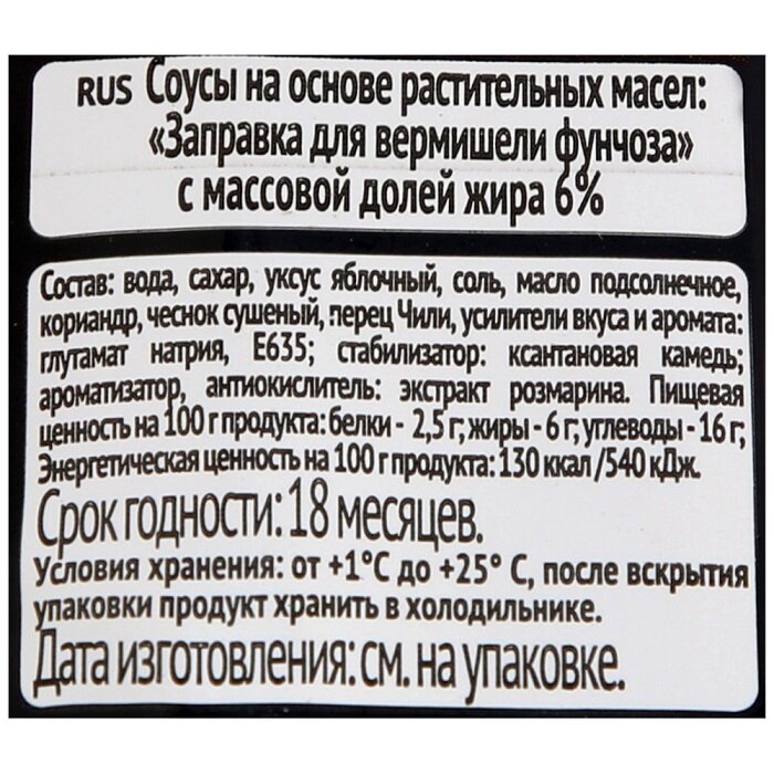 | Состав | вода, сахар, уксус яблочный, соль, масло подсолнечное, кориандр, чеснок сушеный, перец Чили красный, стабилизатор: ксантановая камедь, ароматизатор, антиокислитель Е307 |