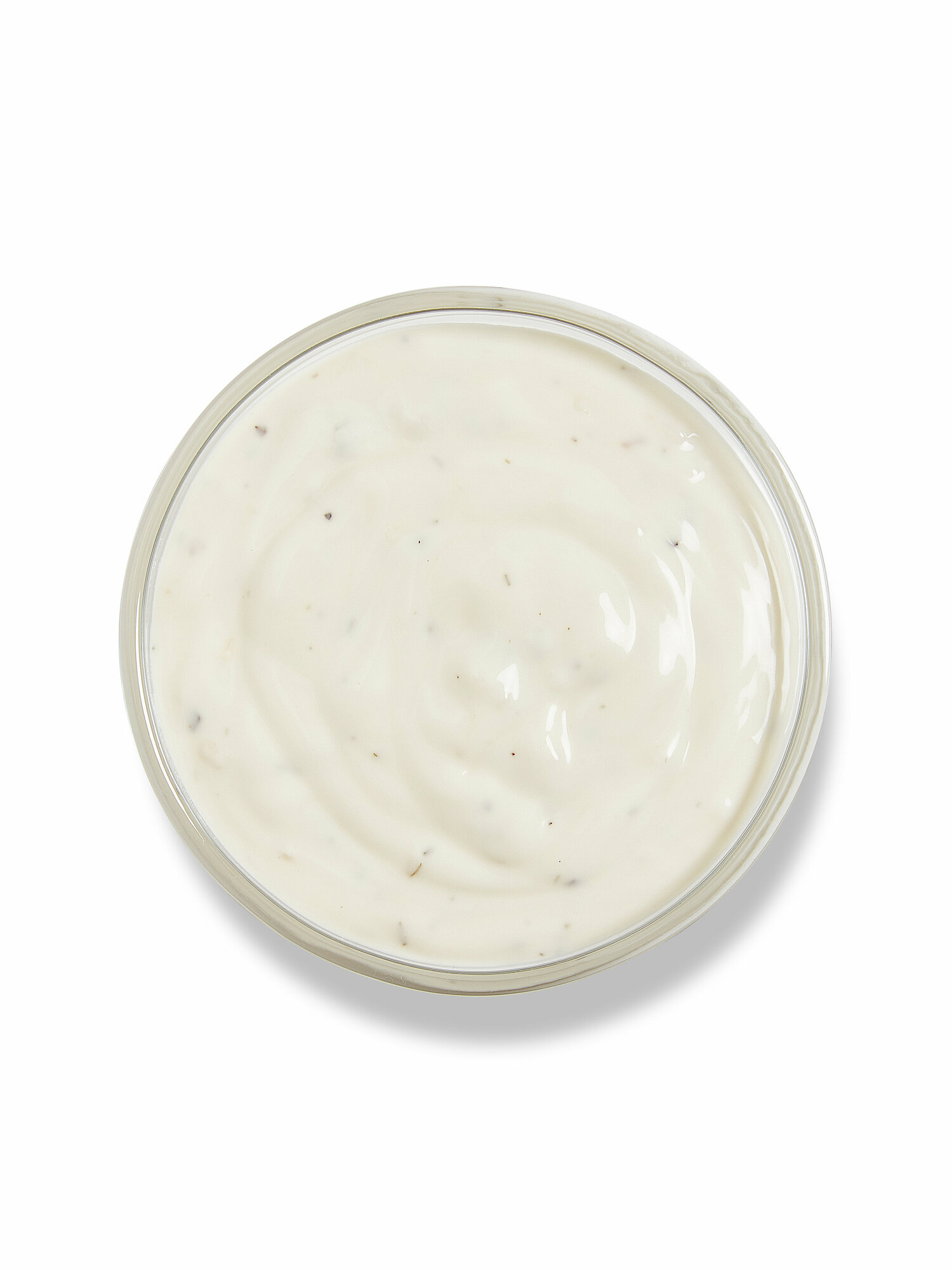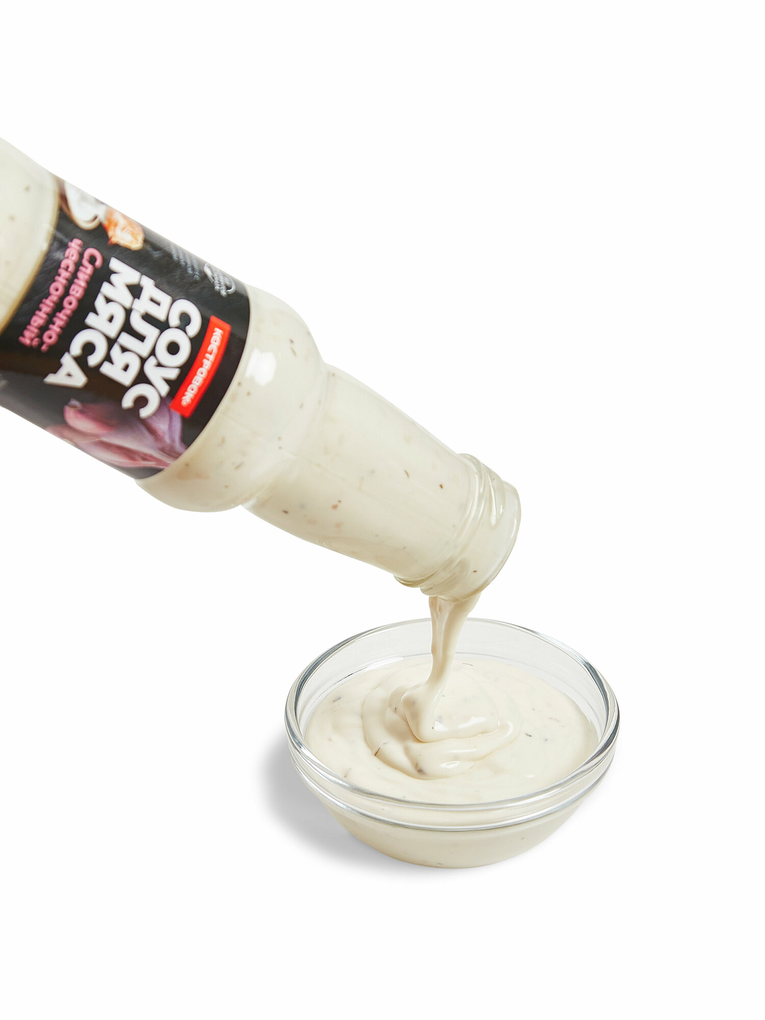 | Состав | Вода питьевая, масло подсолнечное рафинированное дезодорированное, уксус спиртовой, сахар, загустители (ксантановая камедь, Е1422, Е1450), чеснок, соль, сливки, перец черный, орегано, укроп, глюкоза, яичный желток, экстракт черного перца, олеорезин красного стручкового перца, мальтодекстрин, антиокислители (лимонная кислота, Е319, Е385), ароматизатор натуральный. |