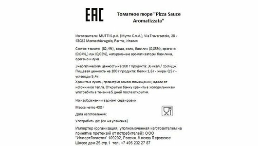 | Состав | Томаты (82,4%), вода, соль, базилик (0,05%), орегано (0,04%), лук (0,03%), натуральные ароматизаторы базилика, орегано и лука. |