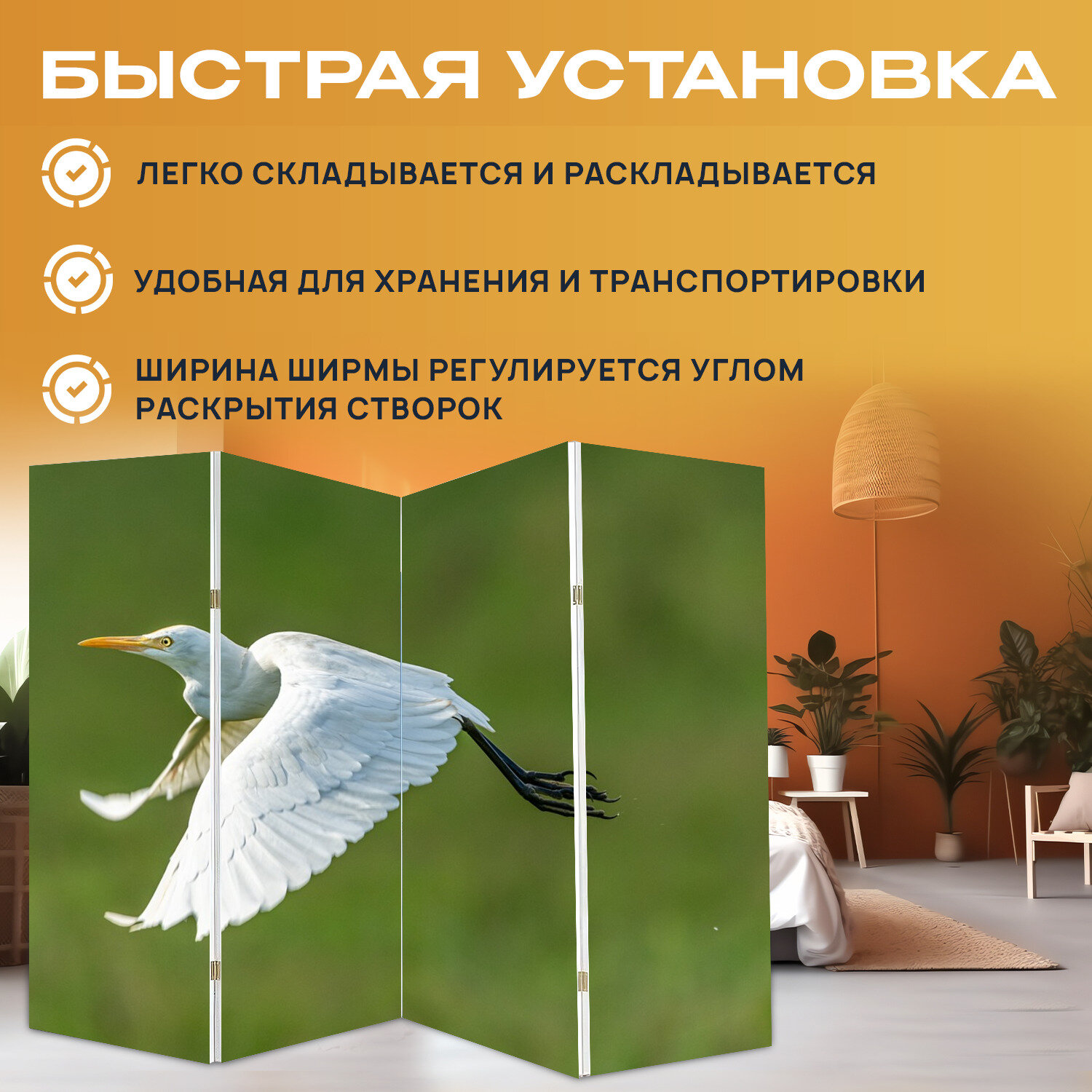 Купить Ширма "Цапля, белый, полет" раскладная перегородка для зонирования с принтом на холсте