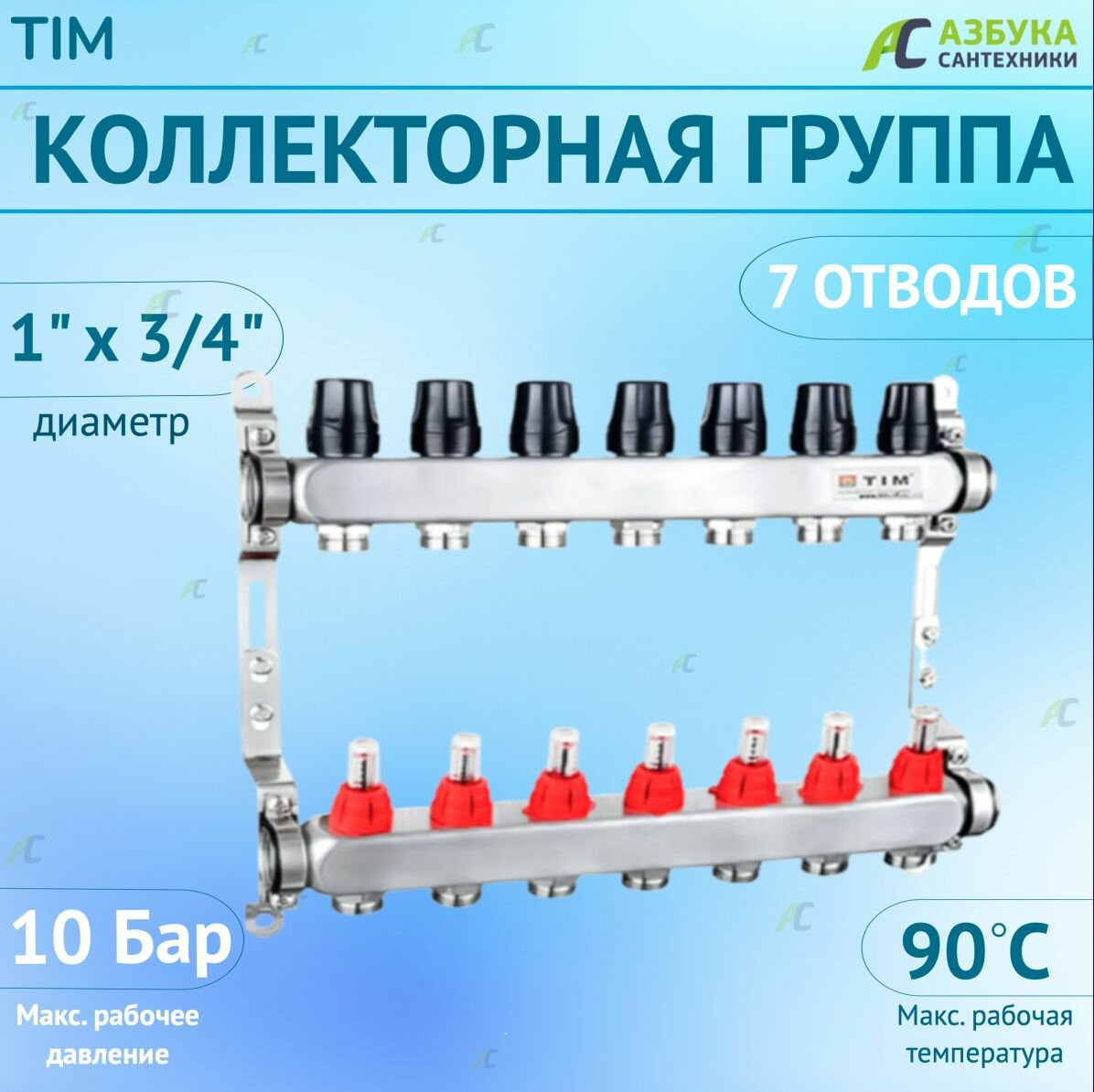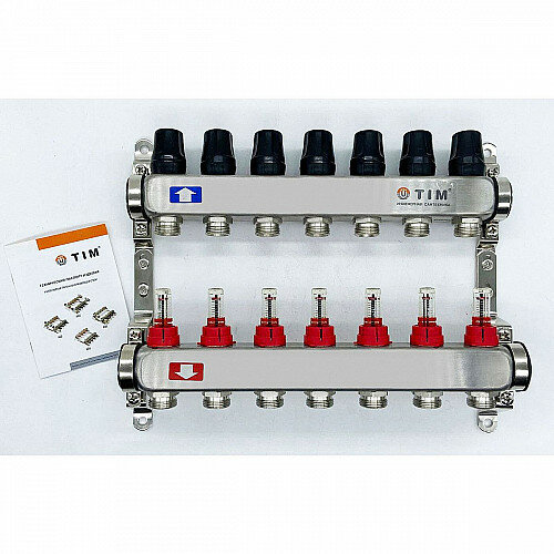 Купить Коллектор с расходомерами из нержавеющей стали для теплого пола 1", 7 выходов 3/4 TIM KDS5007