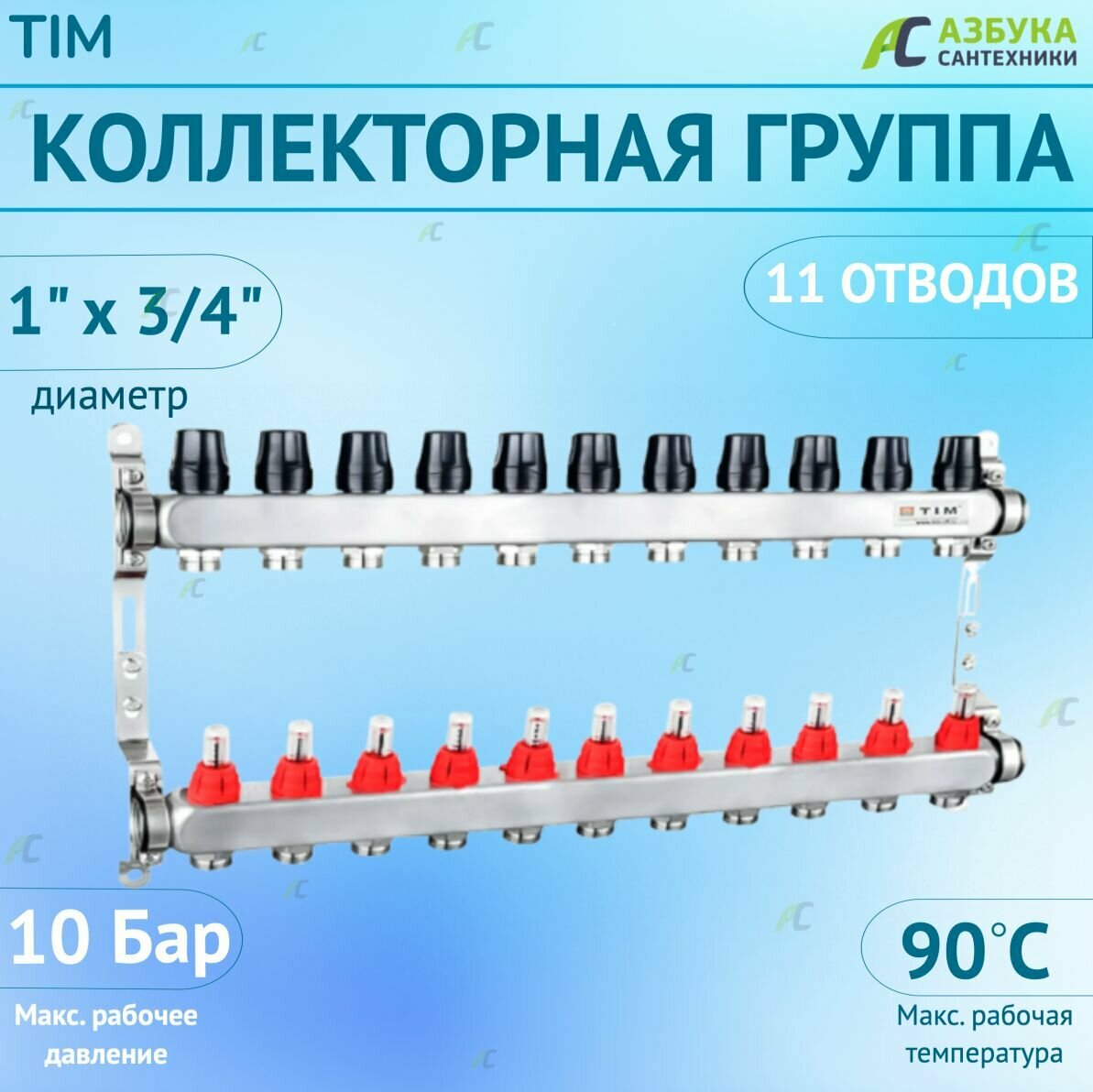 Купить Коллектор с расходомерами из нержавеющей стали для теплого пола 1", 11 выходов 3/4 TIM KDS5011