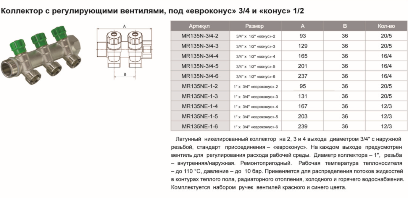 TiM MR135NE-1-5 (1' х 3/4"х5 выходов), Коллектор регулирующий под 45° интересное: