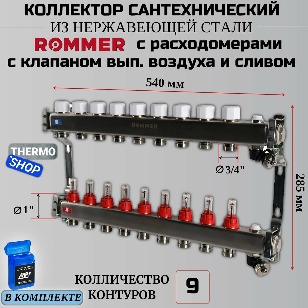 Купить Коллектор из нержавеющей стали с расходомерами, с клапаном вып. воздуха и сливом 9 вых. ROMMER RMS-1201-000009