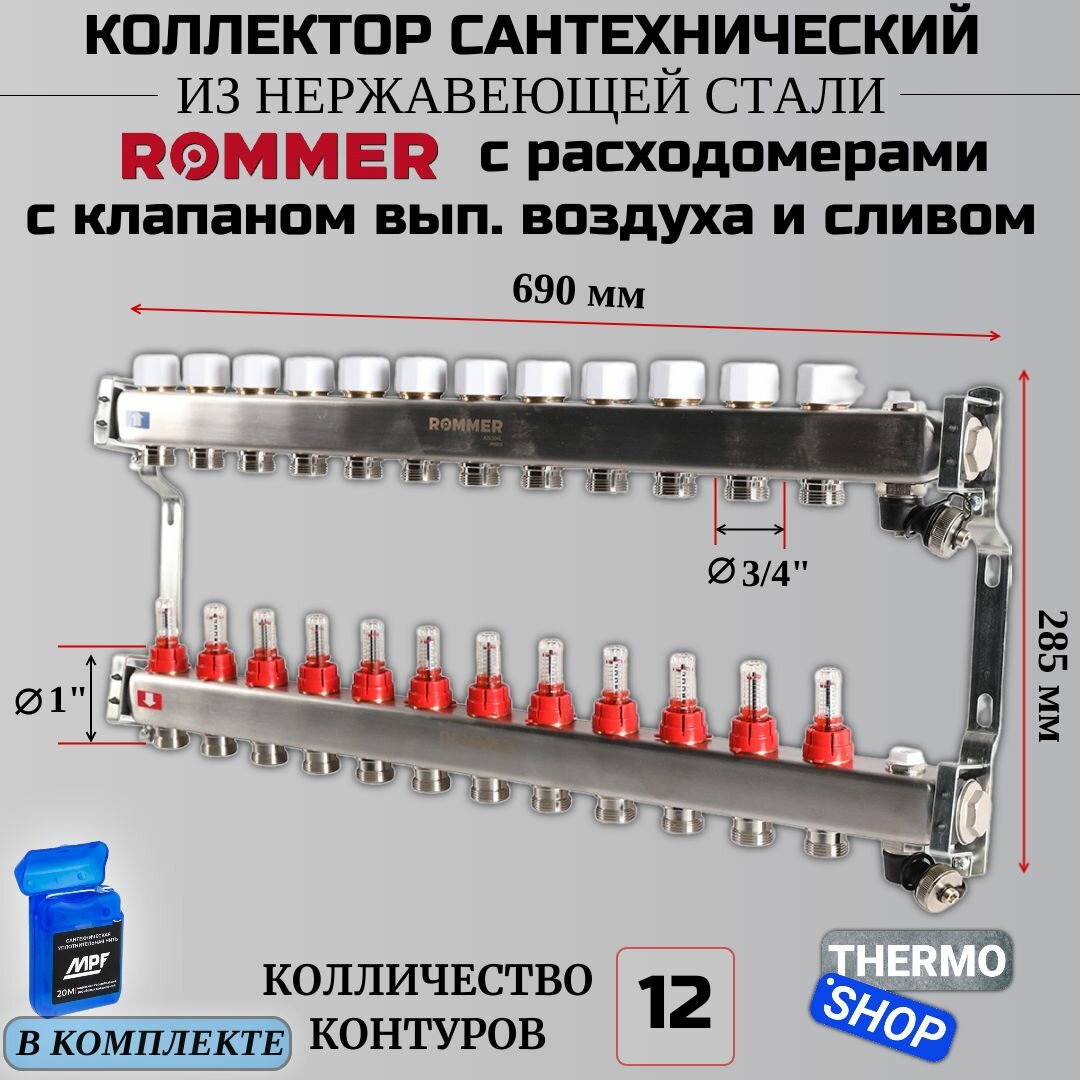 Купить Коллектор сантехнический 12 выходов для водоснабжения, из нержавеющей стали с расходомерами Сантехническая нить 20 м