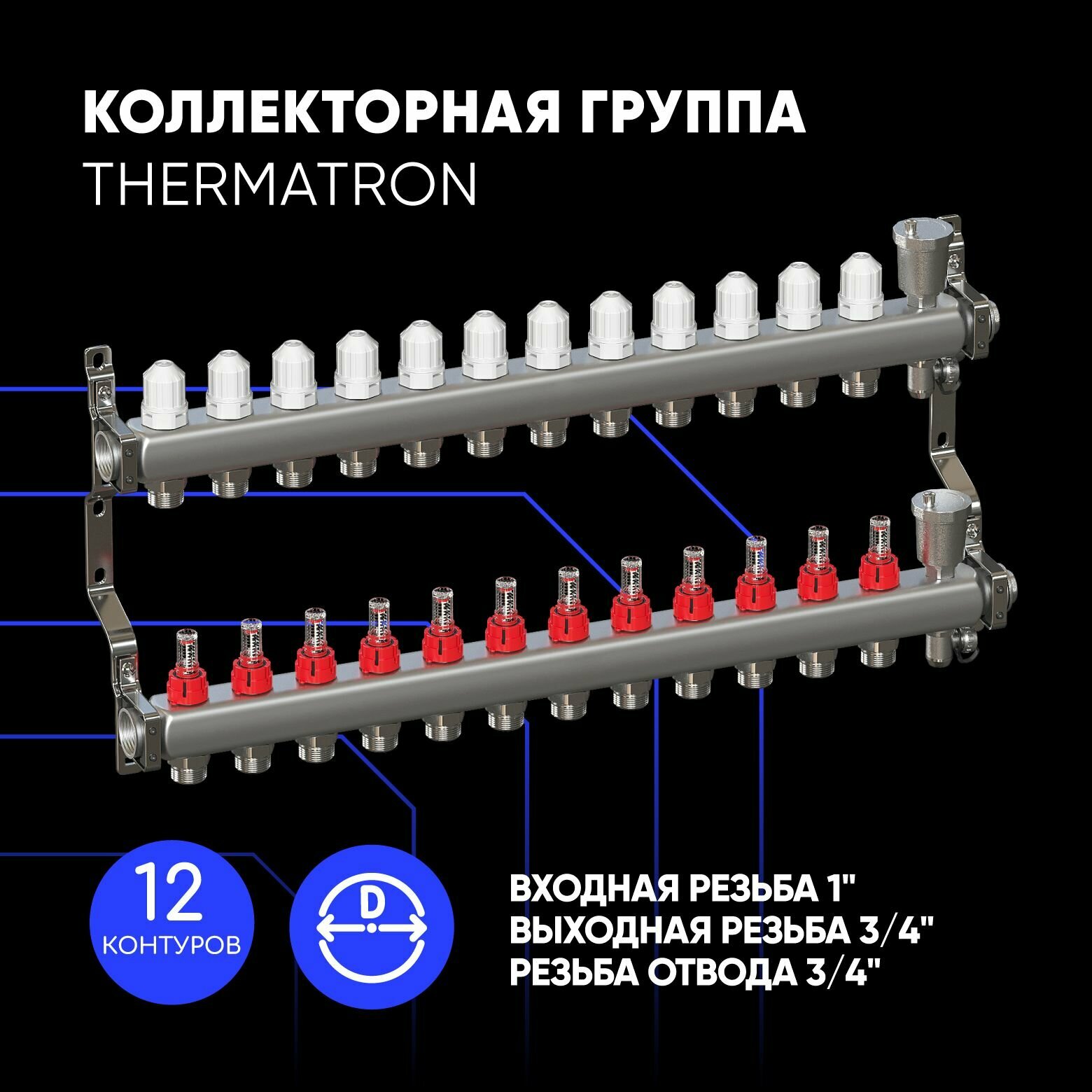 СохранитьКоллекторная группа 1"х12 вых. Евроконус 3/4" с расходомерами, автомат. воздухоотвод ThermaTron (нерж. сталь) интересное: