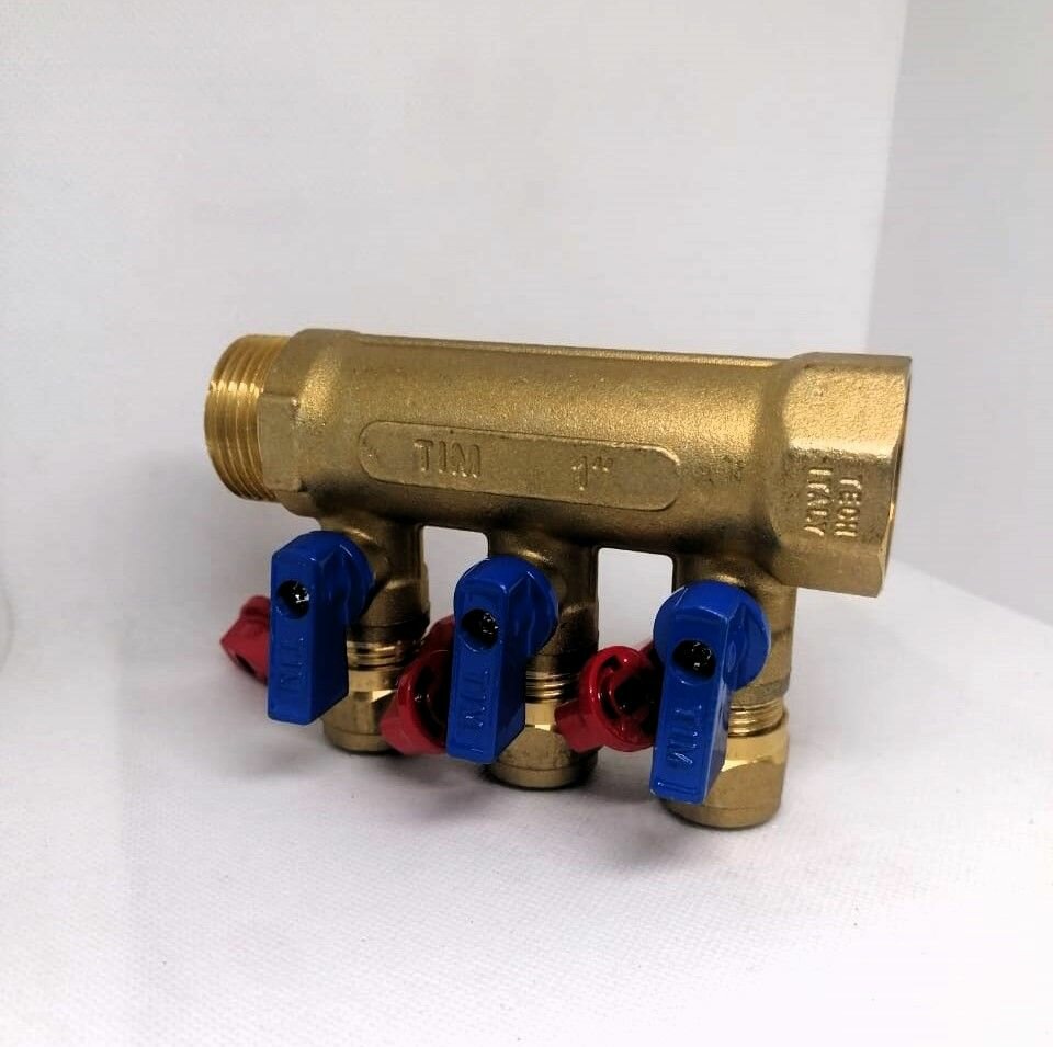 Коллектор с шаровыми кранами и цангами 20х1" TIM, 3 выхода (красные и синие ручки в комплекте) арт. 200-1(3)-20