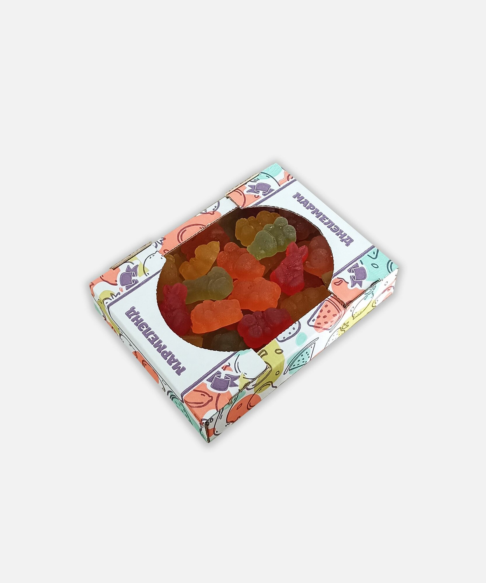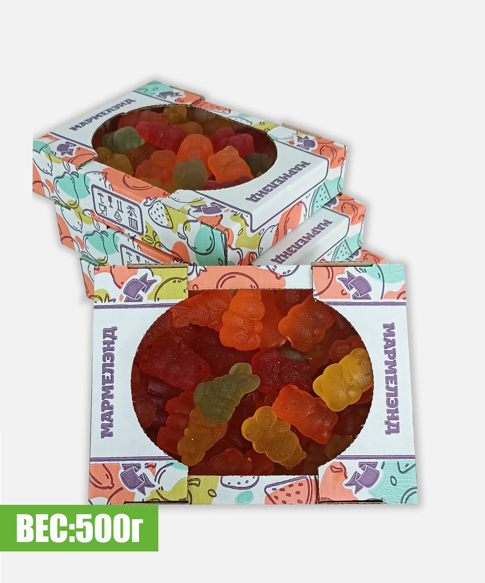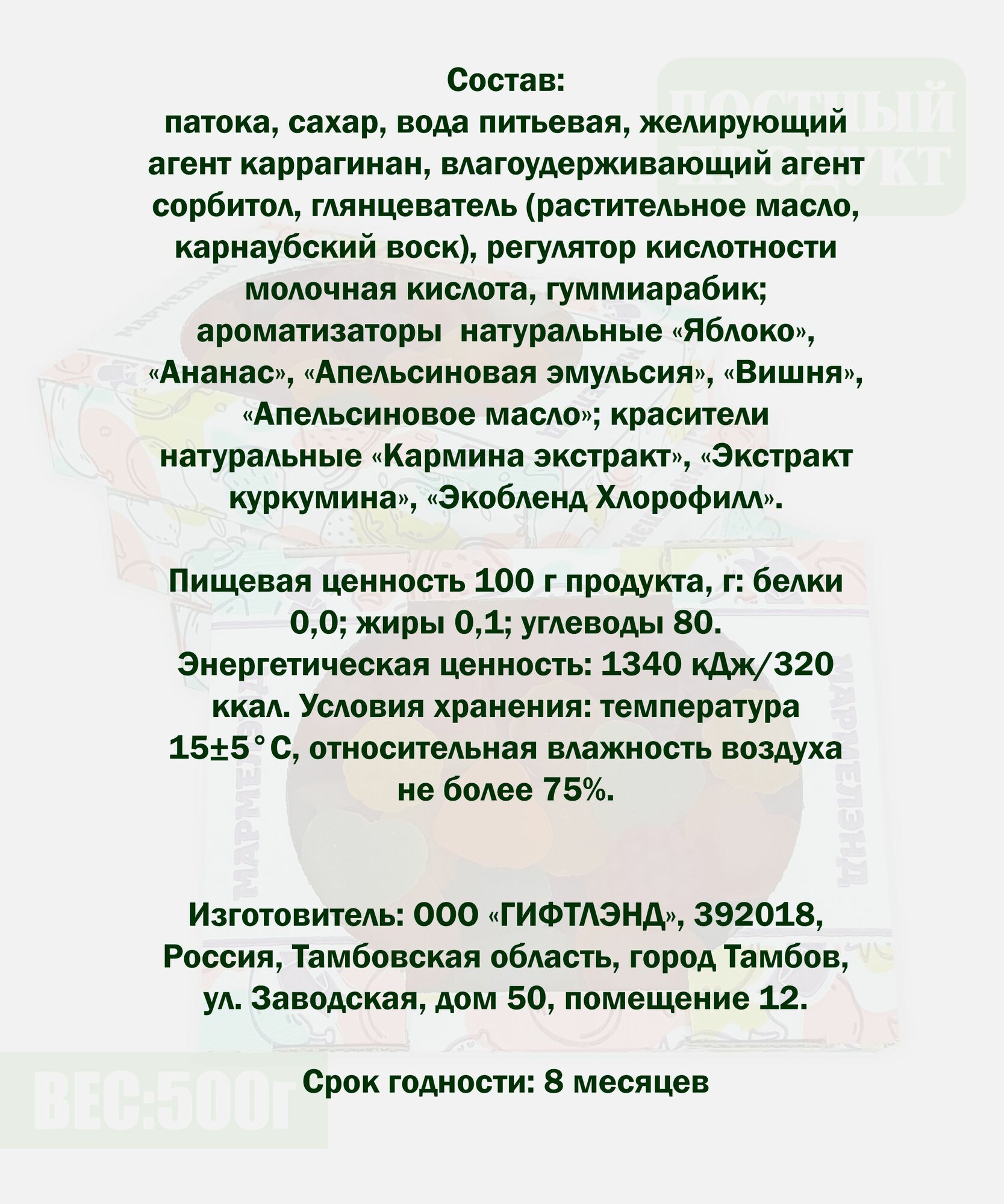 | Состав | Состав: патока, сахар, вода питьевая, желирующий агент каррагинан, влагоудерживающий агент сорбитол, глянцеватель (растительное масло, карнаубский воск), регулятор кислотности молочная кислота, гуммиарабик; ароматизаторы натуральные «Яблоко», «Ананас», «Апельсиновая эмульсия», «Вишня», «Апельсиновое масло»; красители натуральные «Кармина экстракт», «Экстракт куркумина», «Экобленд Хлорофилл». Пищевая ценность 100 г продукта, г: белки 0,0; жиры 0,1; углеводы 80. Энергетическая ценность: 1340 кДж/320 ккал. |