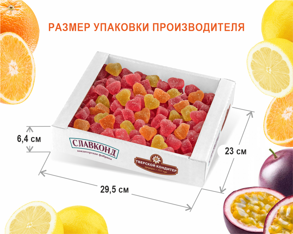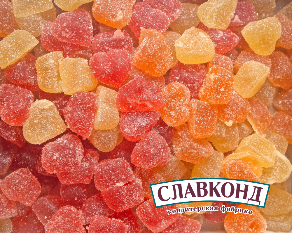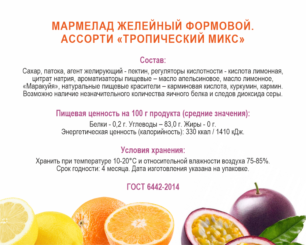 | Состав | Состав: сахар, патока, агент желирующий - пектин, регуляторы кислотности - кислота лимонная, цитрат натрия, ароматизаторы пищевые – масло апельсиновое, масло лимонное, «Маракуйя», натуральные пищевые красители – карминовая кислота, куркумин, кармин. Возможно наличие незначительного количества яичного белка и следов диоксида серы. |