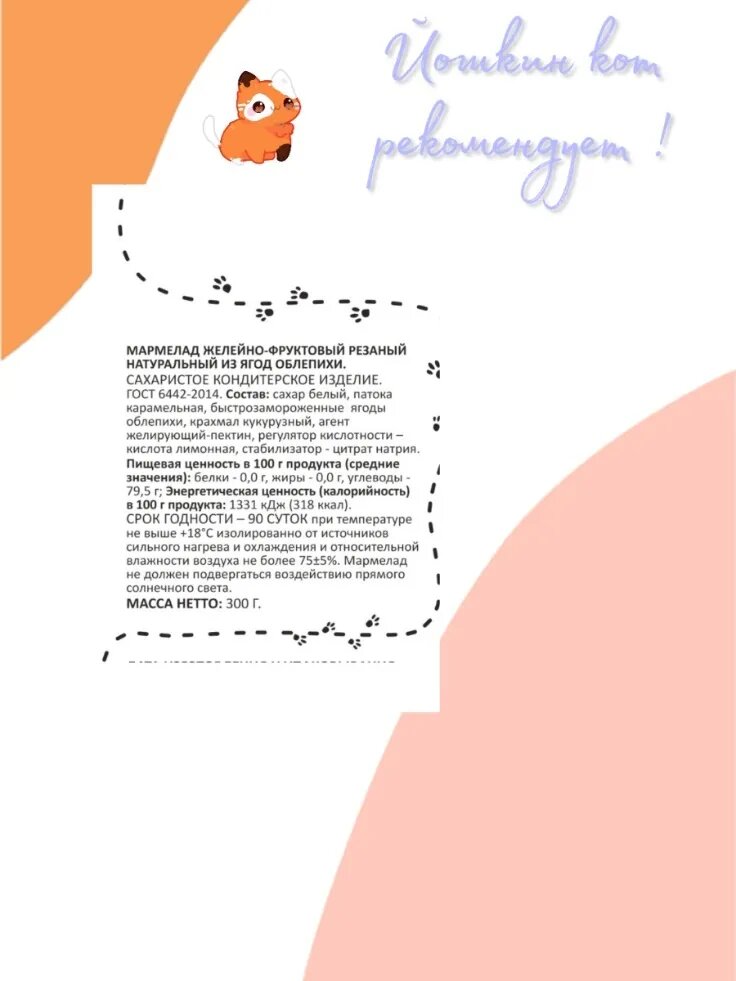 Ниже Вы можете прочитать отзывы на Мармелад Йошкин кот желейно-фруктовый резаный натуральный из ягод облепихи, ознакомится с подробными характеристиками, посмотреть интересные обзоры и фотографии на Мармелад Йошкин кот желейно-фруктовый резаный натуральный из ягод облепихи.