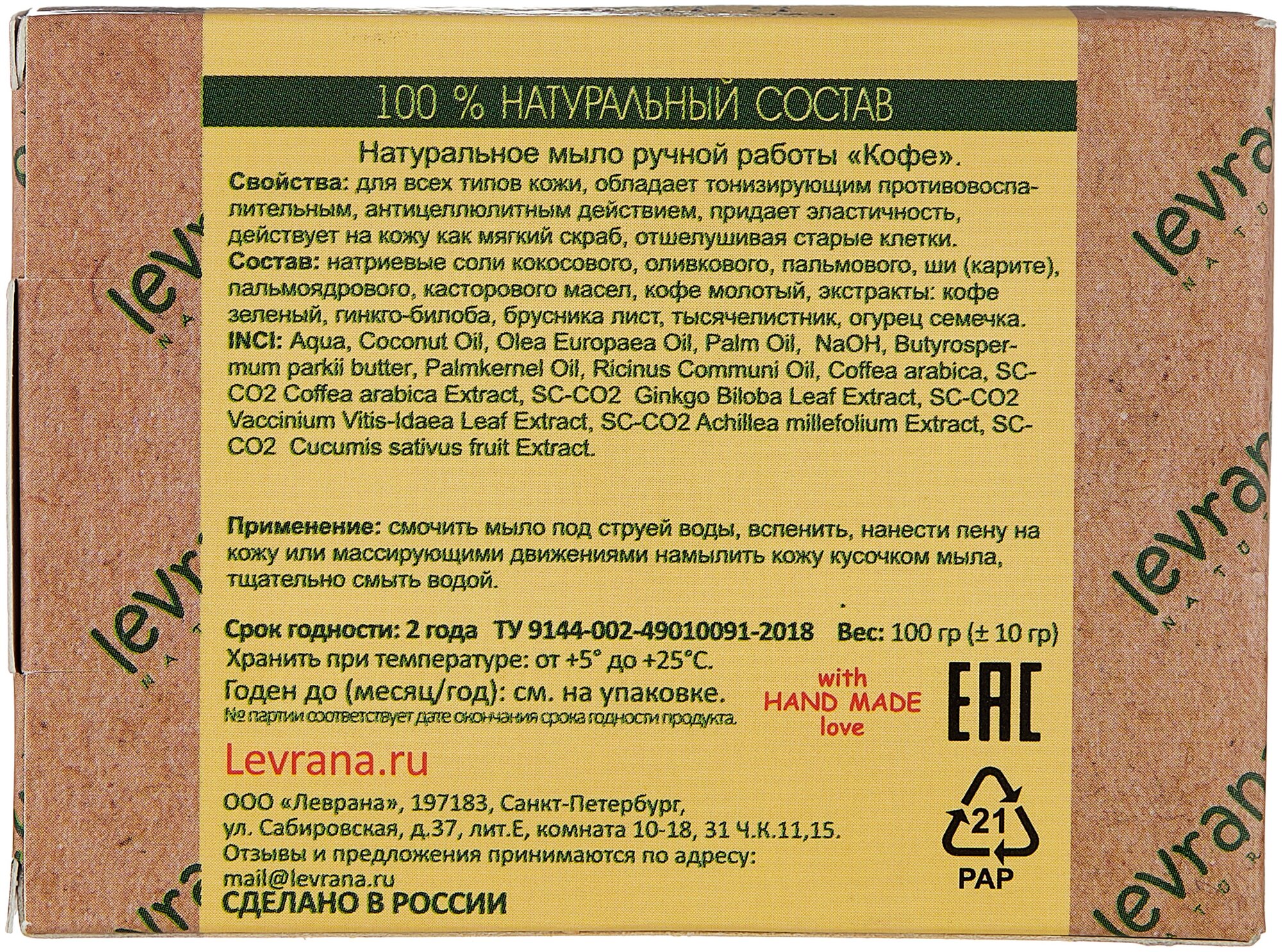 Мыло LEVRANA Натуральное ручной работы "Кофе", 100 г