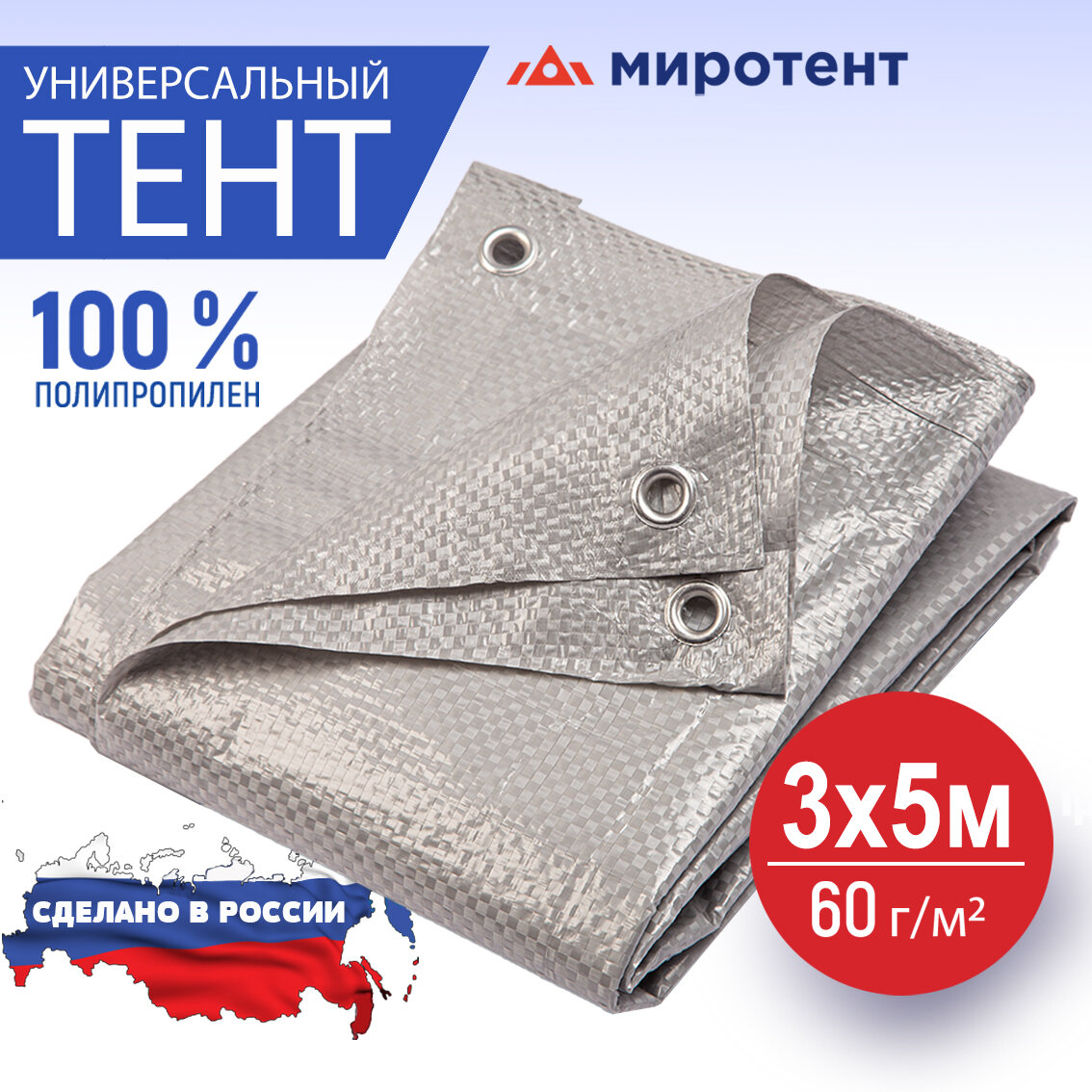 Купить Тент туристический 3х5 м., 60 г/м2 с люверсами (полог строительный, садовый, автомобильный) Миротент, Россия