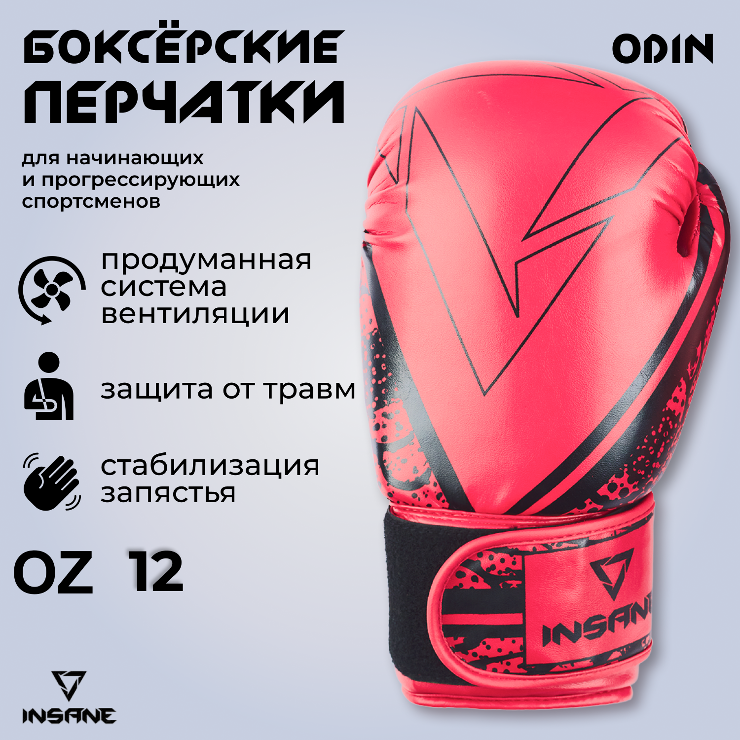 Перчатки боксерские ODIN, ПУ, красный, 12 oz, Insane