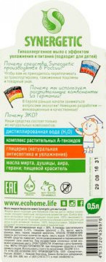 Купить Мыло жидкое 500 мл SYNERGETIC "Луговые травы", гипоаллергенное, биоразлагаемое, дозатор, 105053, 605552