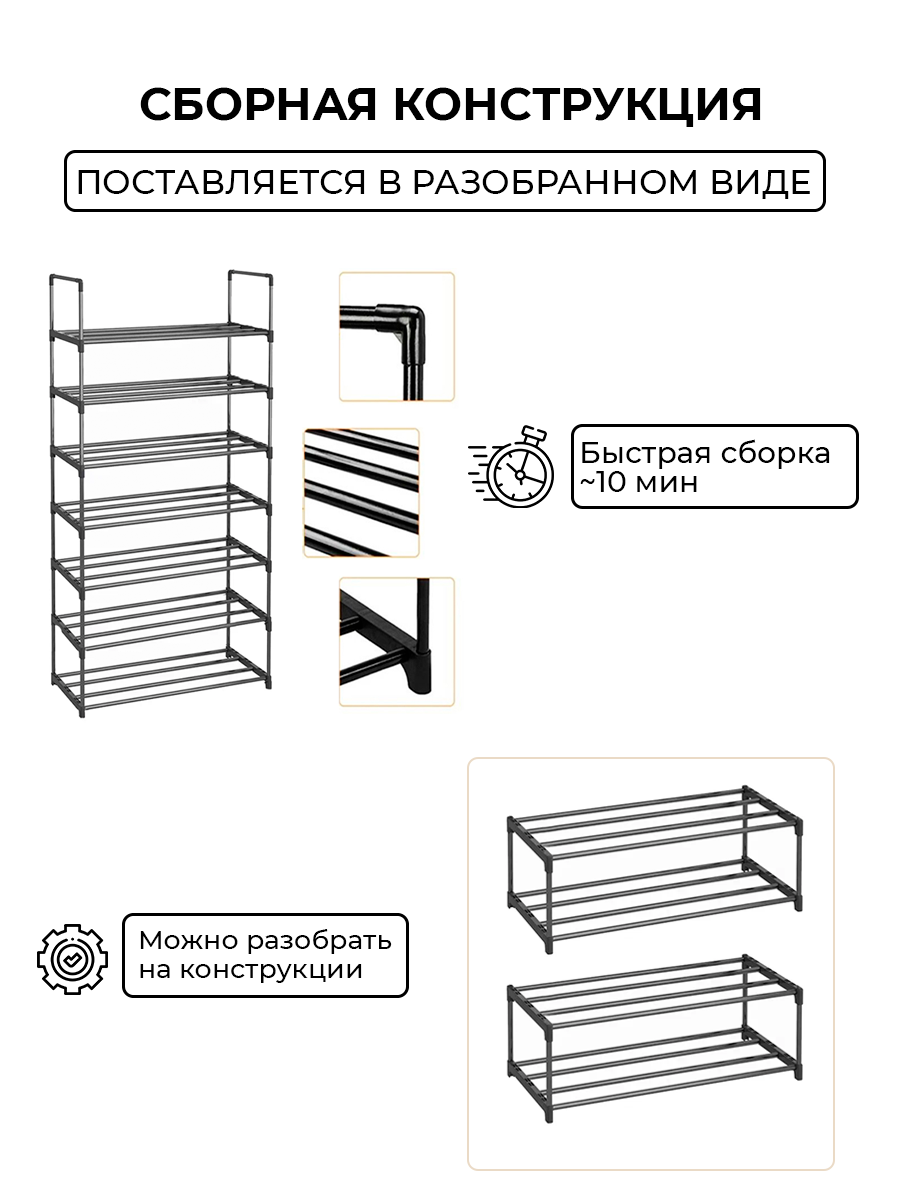 Этажерка для обуви (обувница) в прихожую с 7 полками, нержавеющая сталь, 57х26х122 см, черная интересное: