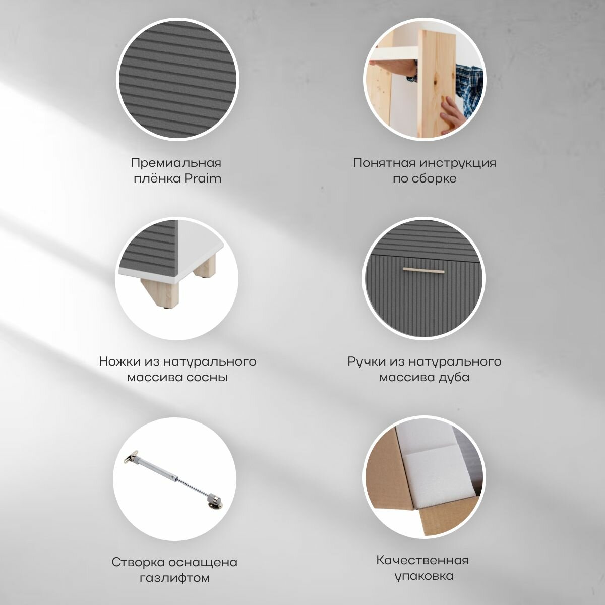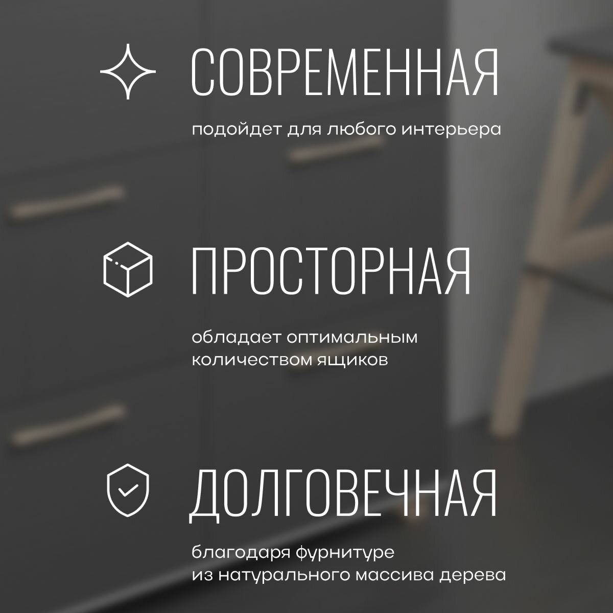 | Комплектация | Всё для сборки находиться в 3 упаковках: фасад - 1 уп., корпус - 1 уп., фурнитура - 1 уп., инструкция по сборке - 1 шт. |