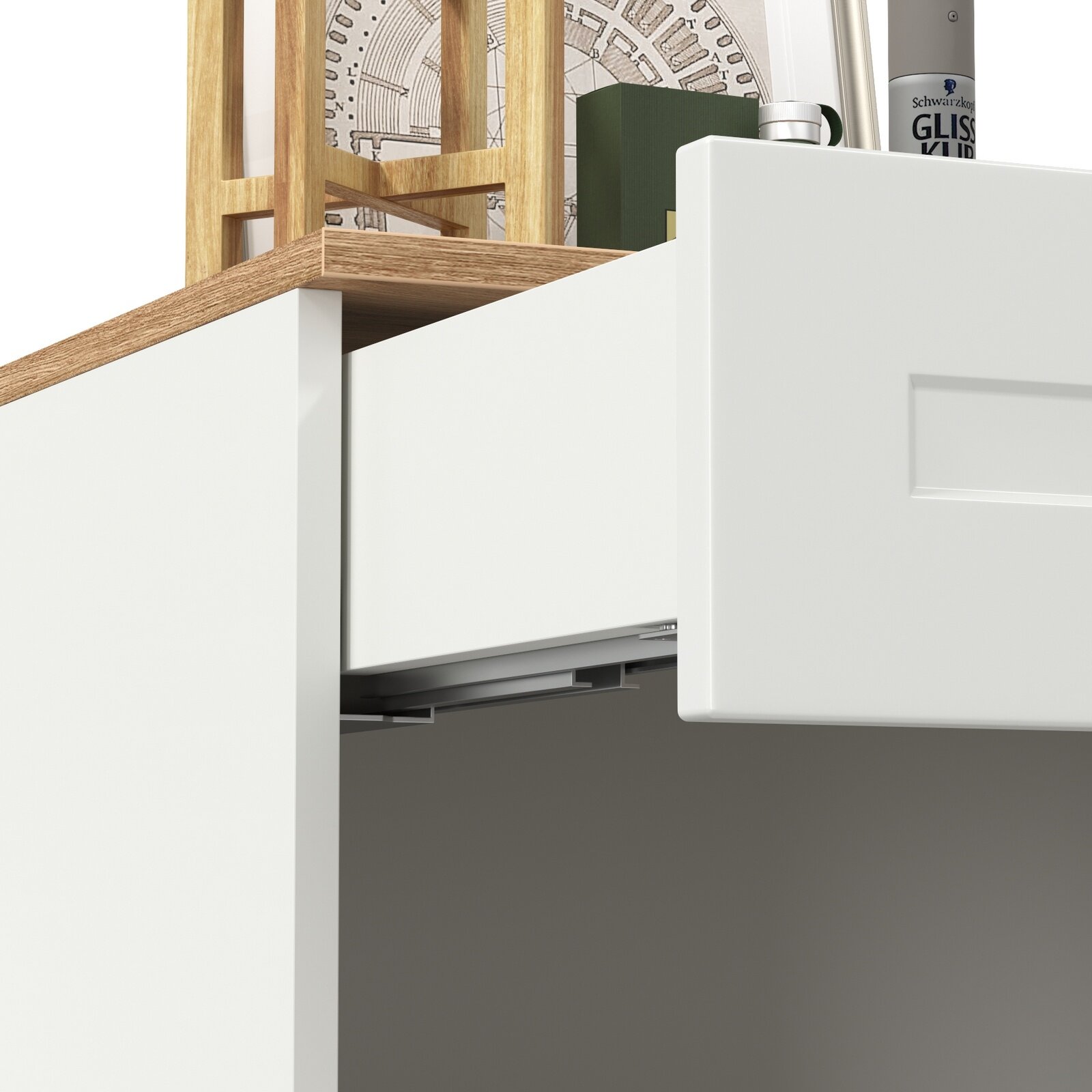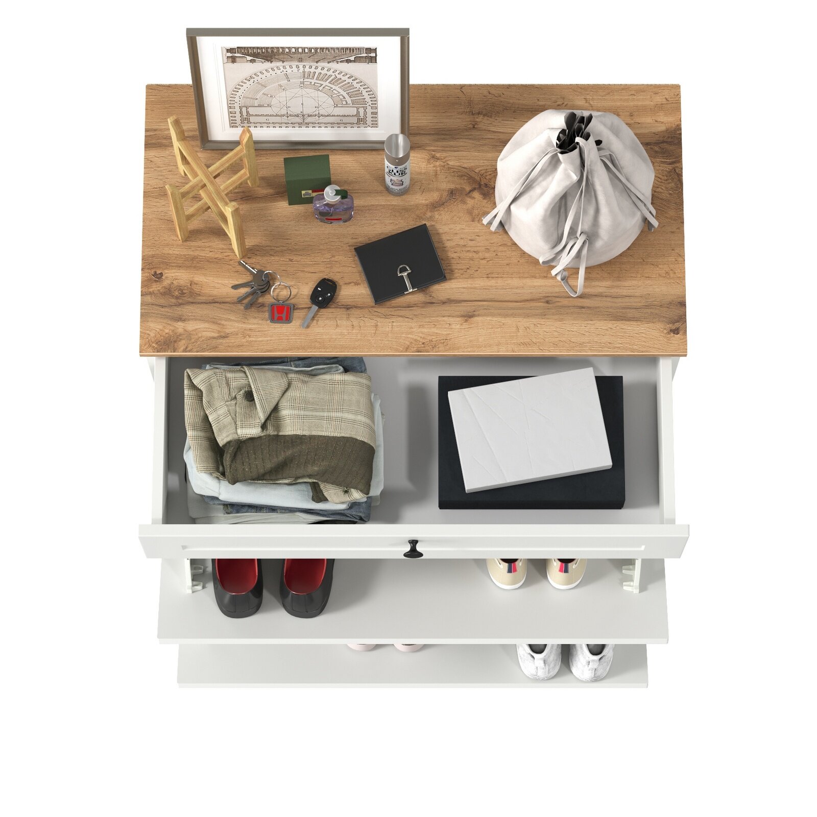 | Комплектация | с выдвижным ящиком для мелочей сверху и двумя откидными дверками с полками для обуви снизу; каждая откидная дверь расчитана для хранения и размещения 6 пар невысокой обуви; скрытые направляющие выдвижных ящиков; двери оснащены четырехшарнирными петлями без доводчиков; регулируемые опоры; лицевая фурнитура в виде черных аккуратных ручек на фасадах |